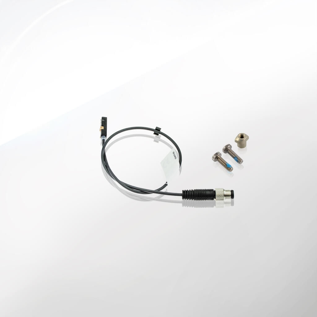 - Umieść czujnik w uchwycie, w miarę możliwości pozostawiając możliwość przesunięcia go wzdłuż siłownika celem precyzyjnej regulacji.