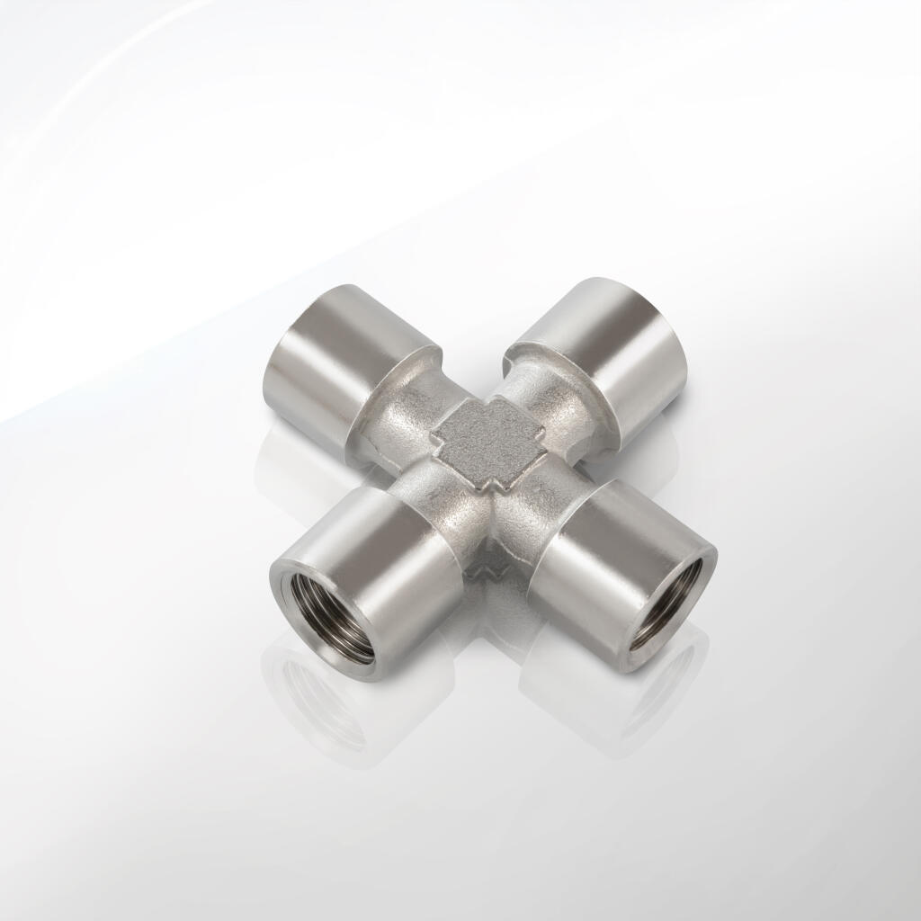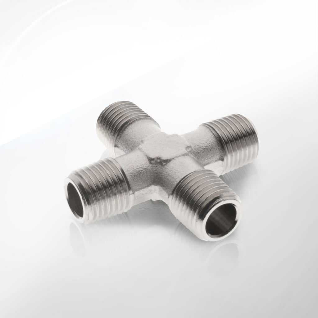 Wszystkie czwórniki posiadają gwinty cylindryczne BSPP zgodne z ISO 228-1, formowane z tolerancją ±0,05 mm, co gwarantuje szczelność i łatwość montażu. Produkcja odbywa się w nowoczesnym zakładzie z pięcioosiowymi centrami CNC, zapewniającymi współosiowość portów i precyzję wymiarową. Każdy element przechodzi rygorystyczną kontrolę jakości: