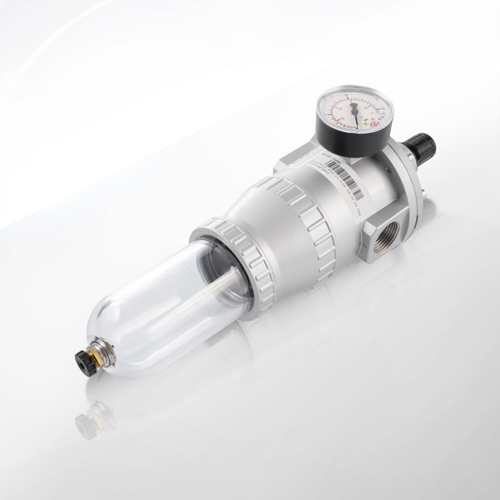 Filtroreduktory serii Maxi to zintegrowane zespoły filtrująco‑redukcyjne przeznaczone do zasilania instalacji sprężonego powietrza o bardzo dużych przepływach. Korpus aluminiowy o wzmocnionych żebrach zapewnia sztywność przy ciśnieniu wejściowym 16 bar, a duże średnice przyłączy G1 gwarantują niski spadek ciśnienia. Wersja podstawowa 80.0201.100927 wykorzystuje przeźroczysty zbiornik z tworzywa, wkład filtracyjny 40 µm oraz manometr radialny; przy nominalnym ciśnieniu 1 MPa (10 bar) osiąga strumień 7000 l/min. Model 80.0201.100939 dodaje metalową osłonę, co podnosi odporność na uderzenia w środowiskach ciężkiego przemysłu. Wariant 80.0201.100933 otrzymuje osłonę poliwęglanową, łącząc przejrzystość z barierą mechaniczną. Portfolio uzupełniają pozycje wysokofiltracyjne 5 µm (np. 80.0201.1008505 G1, 80.0201.1216.05 G1/2) oraz wydajnościowe FD55, gdzie kod 80.0201.1001040 dostarcza 9500 l/min przy zakresie regulacji 0,5–10 bar. Wszystkie moduły wykorzystują membranowy zawór redukcyjny z dociskiem sprężyny kalibrowanej, co zapewnia stabilność ciśnienia nawet przy gwałtownych zmianach poboru. Opatentowany kanał wirujący kieruje strumień ku ściankom zbiornika, wymuszając cyklonową separację kondensatu i zwiększając skuteczność filtra bez wzrostu oporów. Zespół posiada znormalizowane gniazda na zawór elektromagnetyczny soft‑start lub czujnik ciśnienia, co ułatwia integrację z liniami automatycznymi. Producent przewidział trzy rodzaje zbiorników: z tworzywa (niska masa), z tworzywa plus osłona (kontrola wizualna + ochrona) oraz pełny metal (najwyższa wytrzymałość mechaniczna). Dzięki temu konstruktor dobiera konfigurację pod wymagania aplikacji, zachowując zunifikowany układ portów, wsporników i akcesoriów. Gwinty manometru M52 × 1,5 oraz zintegrowane ślepe oczka pod szybkozłączki przyspieszają uruchomienie szafy pneumatycznej. Każdy filtroreduktor Maxi przechodzi test szczelności 100 % przy 17,6 bar oraz badanie stabilności ciśnienia w pełnym zakresie nastaw. Standardowe uszczelnienie NBR toleruje +60 °C, a opcjonalne FKM podnosi górną granicę do +120 °C. Seria wspiera modułowe łączenie z naolejaczem Maxi oraz blokami rozdzielczymi, umożliwiając budowę pięcioelementowych stacji PSP bez dodatkowych łączników. W dobie Przemysłu 4.0 filtroreduktor staje się nie tylko pasywnym filtrem, lecz aktywnym węzłem, redukującym energię sprężania dzięki minimalnym stratom, poprawiającym OEE maszyn i wydłużającym żywotność narzędzi pneumatycznych