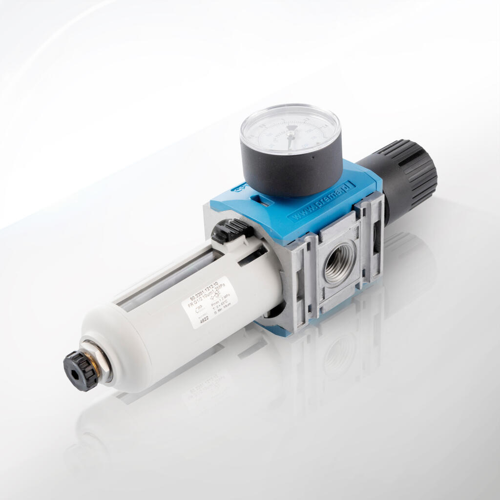 Po filtrze struga powietrza trafia do reduktora membranowego. Membrana to laminat NBR-poliester o grubości 0,6 mm. W ciągu pięciuset tysięcy cykli nie traci elastyczności. Sprężyna nastawcza – zielona, żółta lub czerwona – odpowiada za wąski, średni lub szeroki zakres regulacji. Ta barwna identyfikacja skraca czas serwisu, bo mechanik od razu widzi, jaką część trzyma w ręku. Pokrętło wykonano z ABS-GF30; podziałka laserowa co 0,2 bar prowadzi oko operatora, a pierścień „push-to-lock” blokuje nastawę, gdy linia drga. Histereza całego układu nie przekracza 0,15 bar – to oznacza, że przy skoku przepływu o kilkaset litrów na minutę ciśnienie wyjściowe zmieni się nie więcej niż o 150 mbar.