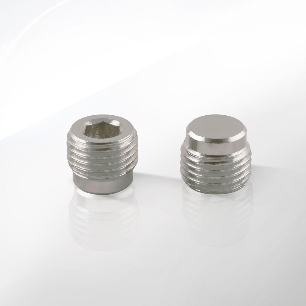 80.0131 – korki nakręcane z gwintem zewnętrznym, mosiądz niklowany, do zamykania standardowych przyłączy.