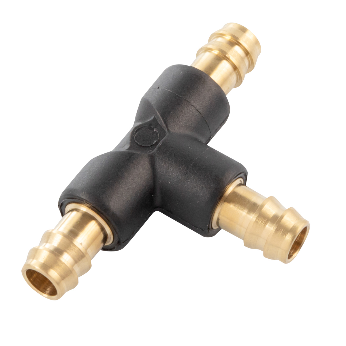 Łącznik karbowany trójstronny typu T D 2, choinka do węża fi 2 mm, mosiądz, korpus tworzywo