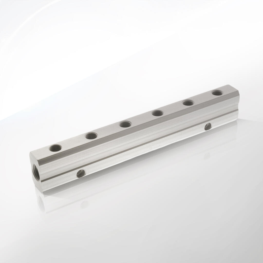 Korpusy wykonujemy z litego profilu aluminium EN AW-6060. Stop ten łączy lekkość z dużą wytrzymałością mechaniczną. Dla prostych kształtów wykorzystujemy ekstruzję. W bardziej złożonych miejscach stosujemy odlewanie ciśnieniowe. W obu procesach kontrolujemy temperaturę i ciśnienie, by uzyskać gładkie powierzchnie i powtarzalne wymiary. Po formowaniu obrabiamy detale na obrabiarkach CNC. Frezujemy przyłącza główne, odgałęzienia oraz rowki pod o-ringi. Każdy gwint wykonujemy zgodnie z normą ISO 228-1, z tolerancją ± 0,02 mm na średnicy i skoku. Wersje kwasoodporne poddajemy dodatkowej pasywacji, by chronić powierzchnię przed agresywnymi chemikaliami.