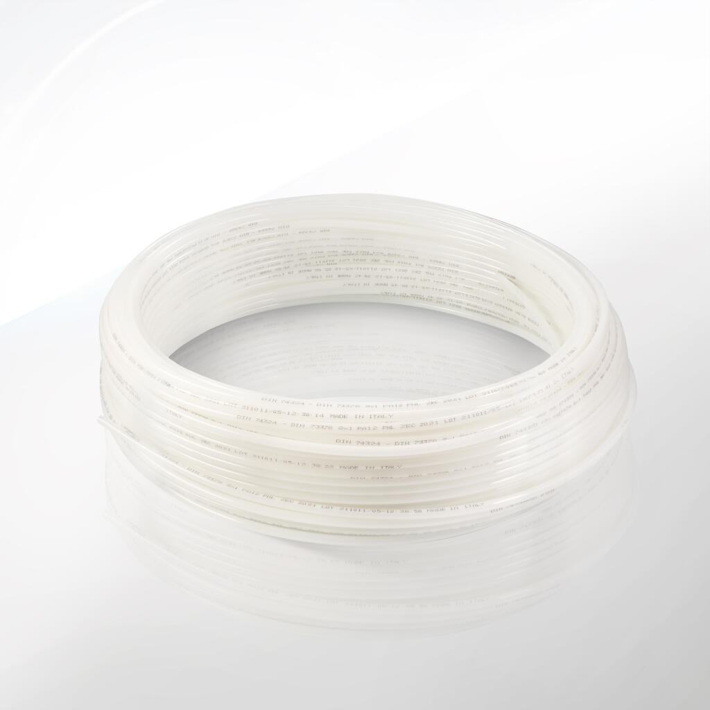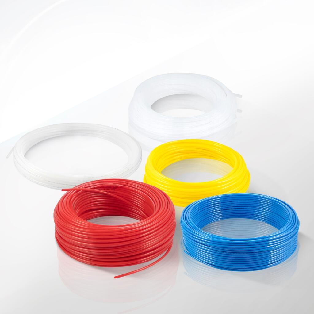 PE (polietylen): do standardowych zastosowań, zasilania siłowników, przesyłu sprężonego powietrza, cieczy neutralnych – lekki, elastyczny, ekonomiczny.