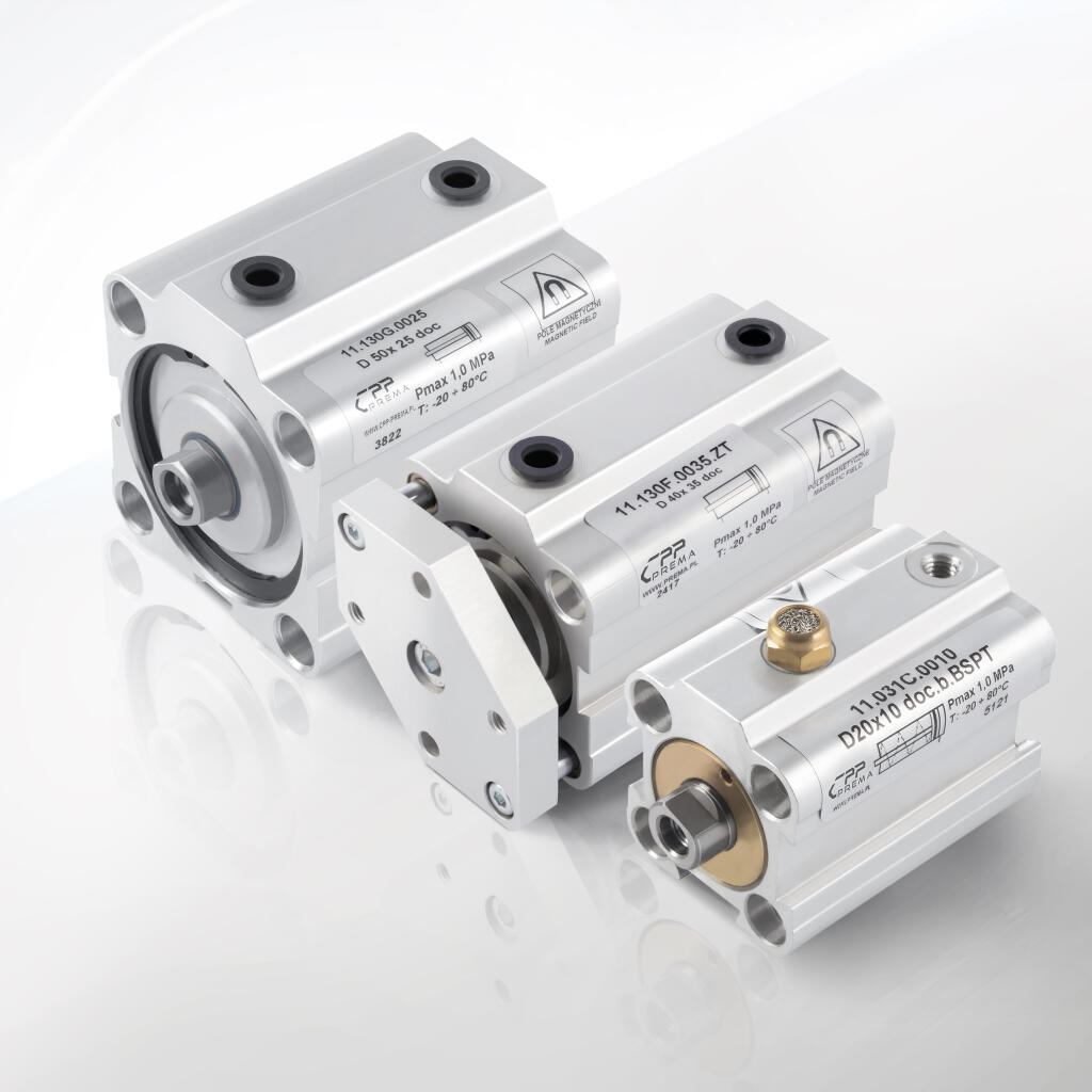 Siłowniki liniowe CPP PREMA występują zarówno w wersji dwustronnego działania (double-acting), gdzie tłok wykonuje ruch w obu kierunkach pod wpływem sprężonego powietrza, jak i jednostronnego działania (single-acting) – np. w siłownikach dociskowych z wbudowaną sprężyną, które wykonują pracę w jednym kierunku, a wracają do pozycji wyjściowej samoczynnie sprężyną. Standardem dla większości modeli są wbudowane magnesy w tłokach do współpracy z czujnikami położenia, a także amortyzacja pneumatyczna (regulowane tłumienie) na końcach skoku, pozwalająca płynnie wyhamować ruch tłoka. CPP PREMA jako producent z ponad czterdziestoletnim doświadczeniem kładzie nacisk na zgodność z normami wymiarowymi – siłowniki ISO 15552 (profilowe i z cięgnami/tie-rod) oferowane są w średnicach od D32 do D320 mm zgodnie z VDMA 24562, minisiłowniki ISO 6432 w średnicach D12–D25 mm, zaś siłowniki kompaktowe ISO 21287 w zakresach D16–D100 mm. Wersje CNOMO (seria SCN) obejmują typowe dla tej normy średnice od D32 do D200 mm, zapewniając ujednolicone wymiary montażowe preferowane m.in. w przemyśle motoryzacyjnym Francji i Włoch.