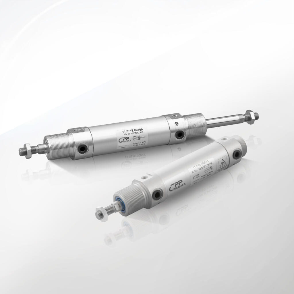 Korpus (tuleja cylindra): Większość siłowników wykonana jest z aluminiowych tulei o przekroju okrągłym lub profilem użebrowanym. Aluminium stosowane w cylindrach jest lekkie, a po poddaniu procesowi anodowania zyskuje twardą, gładką warstwę ochronną odporną na korozję i zużycie. W siłownikach typu ISO 15552 firma CPP PREMA wykorzystuje dwa typy konstrukcji: tuleje gładko-cylindryczne mocowane za pomocą cięgien (szpilek) ze stali oraz tuleje profilowe z rowkami montażowymi (np. seria FORTIS) – obie bazują na stopie aluminium łączącym niską masę z odpowiednią wytrzymałością na ciśnienie. W siłownikach kompaktowych korpus jest zazwyczaj jednolitą bryłą aluminiową (monoblok) z otworami i gwintami montażowymi zintegrowanymi w konstrukcji. Minisiłowniki ISO 6432 tradycyjnie posiadają tuleje ze stali nierdzewnej (cienkościenne rurki ze stali 304) lub z precyzyjnie szlifowanej stali węglowej chromowanej – co zapewnia idealnie gładką powierzchnię wewnętrzną przy bardzo małej średnicy. W przypadku serii SMI (D12–D25) stosuje się często mosiężne niklowane lub aluminiowe końcówki z tuleją ze stali nierdzewnej, co łączy wytrzymałość z odpornością na rdzę w małej skali. Siłowniki nierdzewne SPS posiadają tuleje i pokrywy wykonane w całości ze stali kwasoodpornej, co czyni je odpornymi na mycie chemiczne i korozję w środowiskach spożywczych.