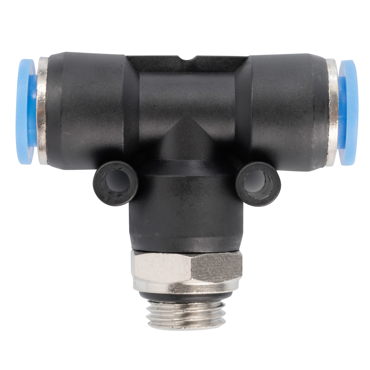 Trójnik wtykowy typu T, gwint zewnętrzny G1/4 do przewodu fi 10 mm, tworzywo sztuczne