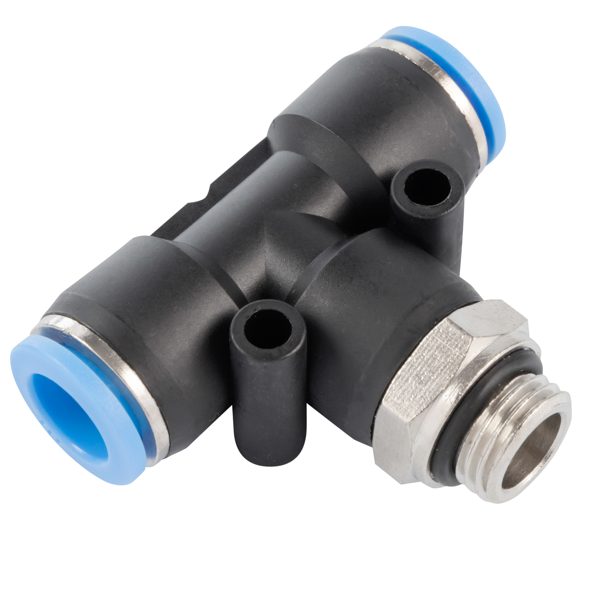 Każde z trzech przyłączy wtykowych wyposażone jest w samozaciskający pierścień sprężysty ze stali nierdzewnej, który obejmuje zewnętrzną ściankę przewodu, zapewniając długotrwałą odporność na wyrwanie i redukując spadki ciśnienia. Wewnętrzna uszczelka wargowa NBR 70 zamyka szczelinę między rurką a gniazdem, tworząc szczelny, bezzwrotny styk nawet przy dynamicznych wahaniach ciśnienia. Konstrukcja symetryczna oznacza, że średnica obu końcowych odgałęzień jest identyczna, a gwint zewnętrzny znajduje się w osi trójnika, co ułatwia projektowanie równomiernie obciążonych rozgałęzień i skraca czasy montażu.