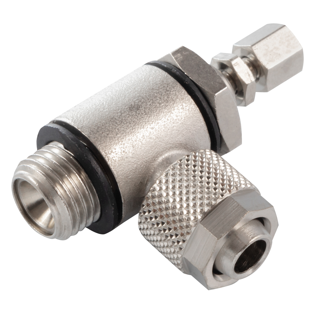 Zawór dławiący skręcany G1/8 na wąż fi 6x4 mm z regulacją pokrętłem, mosiądz niklowany