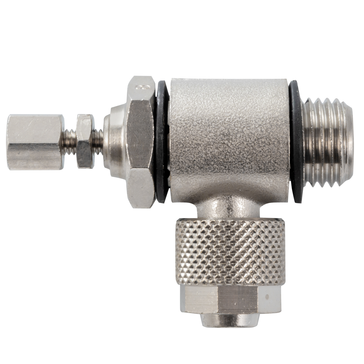 Zawór dławiący skręcany G1/8 na wąż fi 8x6 mm z regulacją pokrętłem, mosiądz niklowany