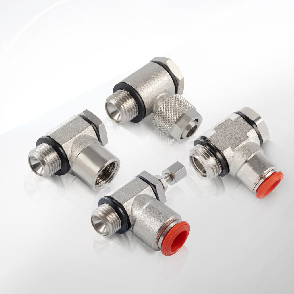 Zawory dławiąco-zwrotne kątowe mosiężne w wersji z pokrętłem regulacyjnym – oferują bardziej precyzyjną regulację natężenia przepływu niż warianty standardowe, umożliwiając dokładne dostrojenie parametrów pracy siłowników. Ryflowane pokrętło zapewnia pewny chwyt i łatwość ustawień nawet w warunkach przemysłowych.