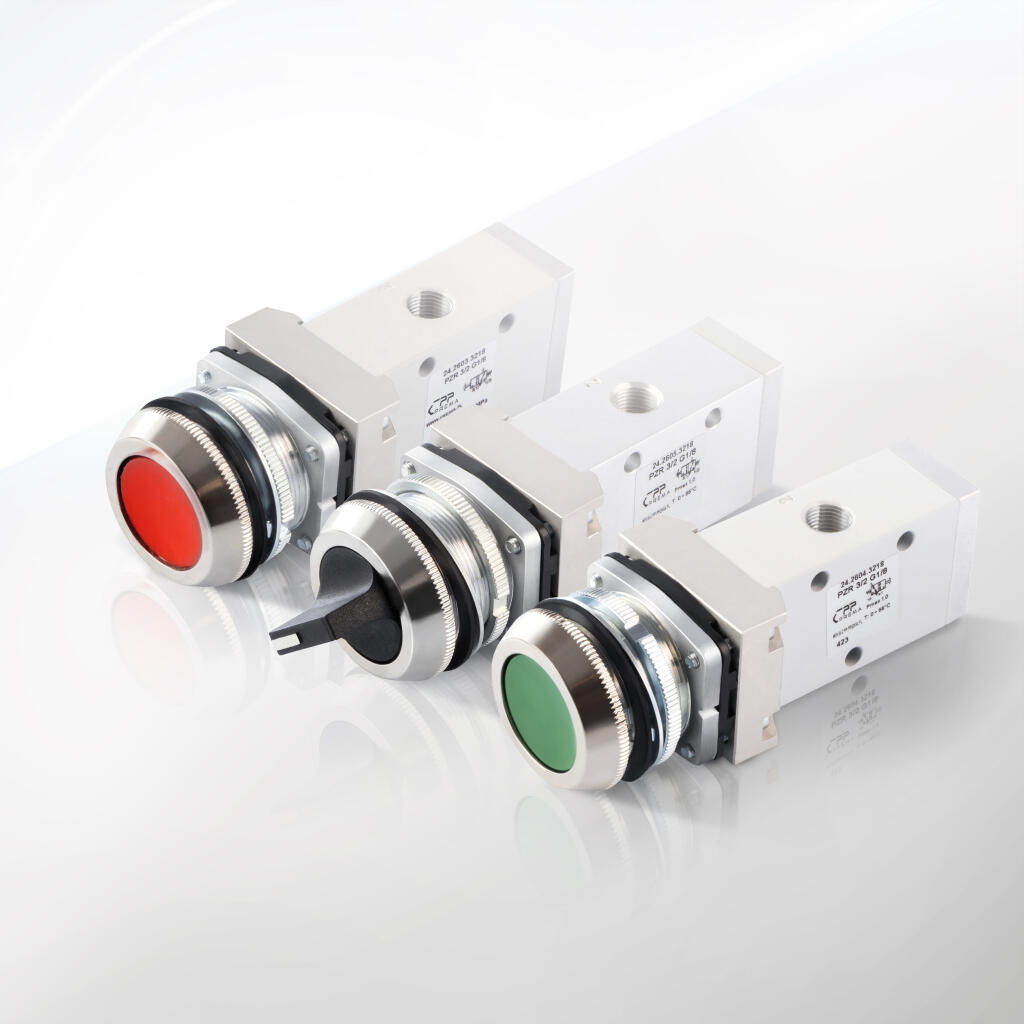 Zestaw zaworów obejmuje różne warianty konstrukcyjne i kolorystyczne przycisków – dostępne są modele z przyciskiem krytym o kolorze czerwonym lub zielonym, przyciskiem pokrętnym, przyciskiem wystającym oraz przyciskiem grzybkowym. Każdy z nich cechuje się wysoką jakością wykonania, niezawodnością działania oraz kompatybilnością z systemami pneumatyki o zróżnicowanych przepływach.