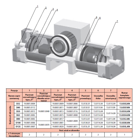 · Zestawy naprawcze są dostępne dla szerokiego zakresu średnic cylindrów – od D32 do D125 mm. Typowe zestawy przeznaczone są do konkretnych modeli siłowników, takich jak 11.036F dla średnicy D40, 11.036G dla D50, 11.036H dla D63, 11.036J dla D80, 11.036K dla D100 oraz 11.036L dla D125. Dla mniejszych siłowników typu SKP o średnicy D32 przewidziano zestaw oznaczony jako 11.050E. Każda jednostka naprawcza została zoptymalizowana pod względem geometrii rowków osadczych, głębokości gniazd i profilu prowadzącego, dzięki czemu komponenty montuje się bez luzów i napięć w strukturze siłownika.