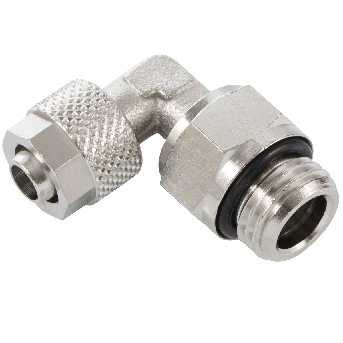 Złączka skręcana kątowa obrotowa, gwint zewnętrzny G1/8 do przewodu fi 6/4 mm, mosiądz niklowany.
