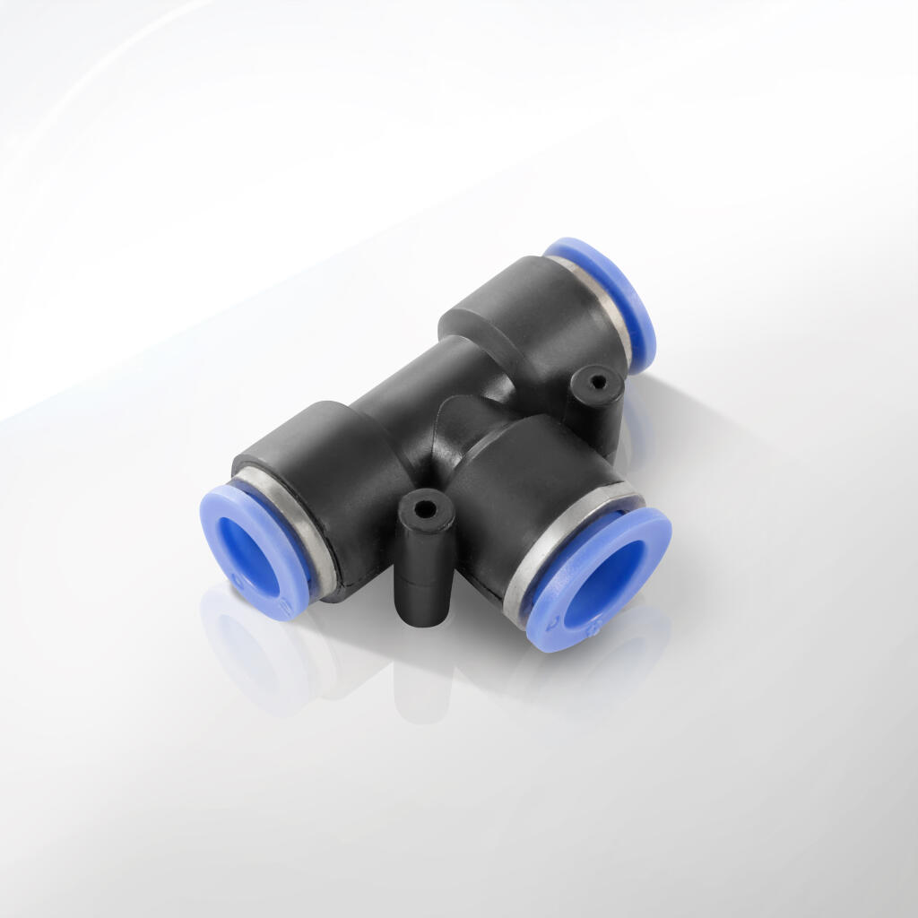 Trójniki redukcyjne typu T (seria 84.0050.21): Rozgałęzienie z redukcją średnicy, np. z 10 mm na 6 mm, stosowane w systemach zróżnicowanego przepływu, takich jak linie montażowe.