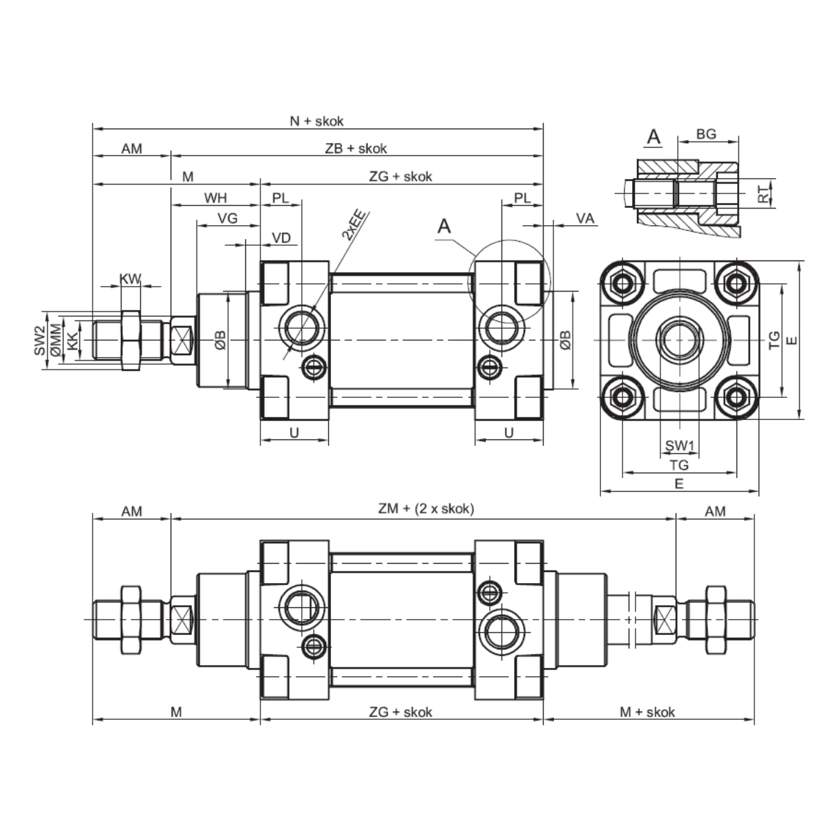 11.017H.0350AS - Siłownik ISO15552/6431 D63x350, dwustronne wydłużone tłoczysko +55 mm do osłony 19.016H.21.0450