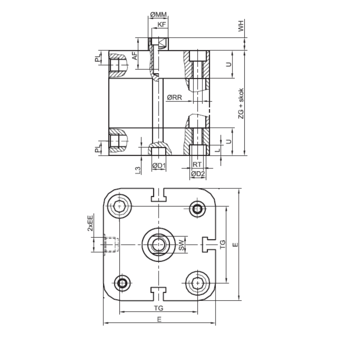 11.040D.0016 - Siłownik kompaktowy D25x16 ISO21287 dwustronnego działania, gwint wewnętrzny
