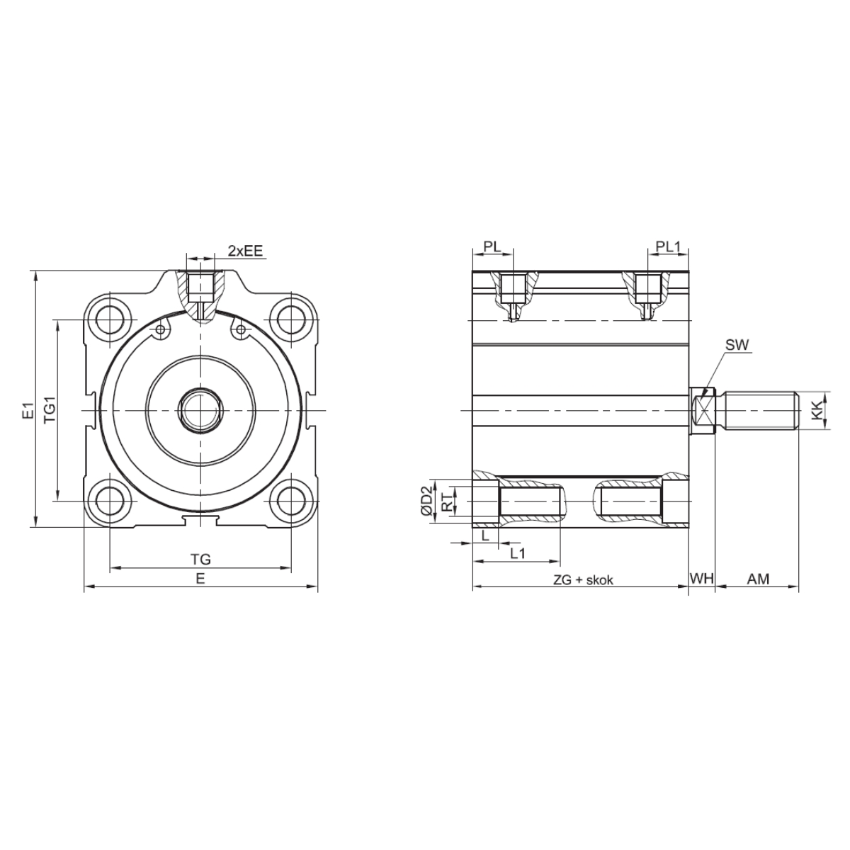 11.130H.0060.GZ - Siłownik pneumatyczny dociskowy D63x60 dwustronnego działania, gwint zewnętrzny