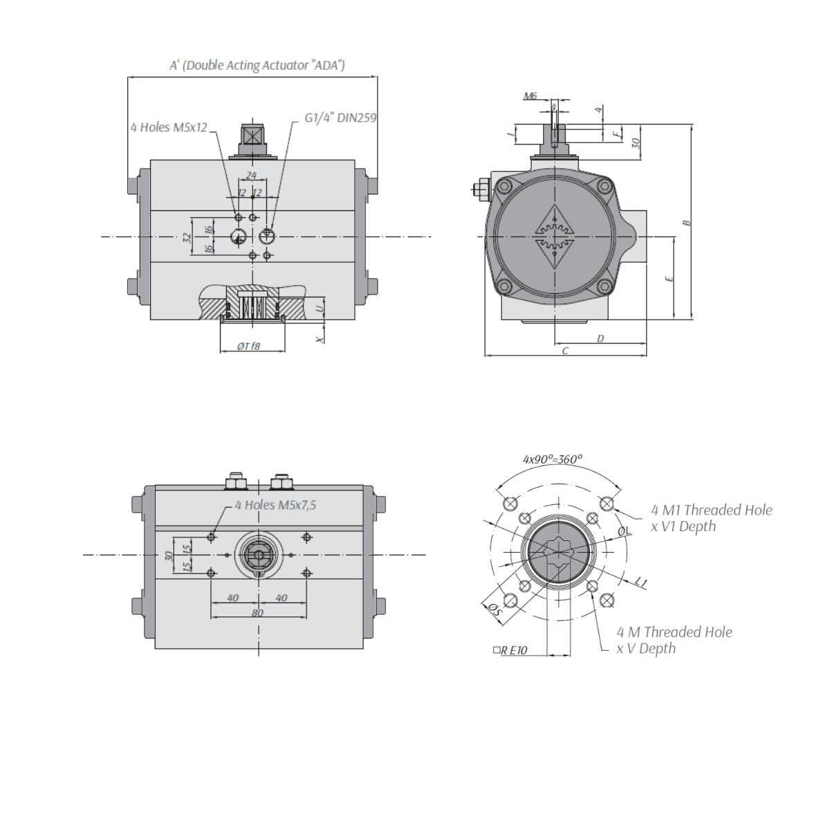 14.ADA300.F07F10.R22 - Siłownik obrotowy dwustronnego działania ADA300, ISO 5211 F07/F10, kwadrat 22 mm