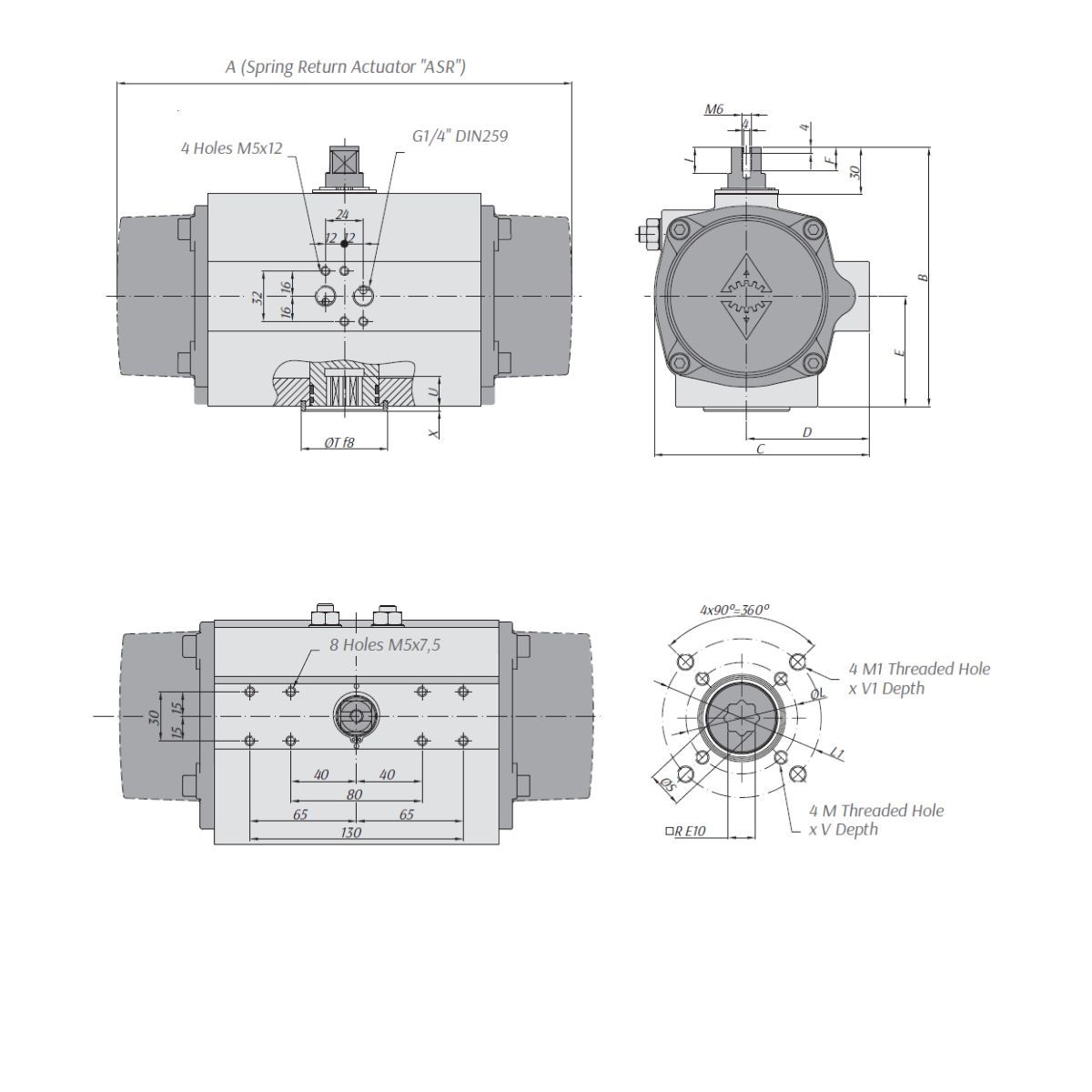 14.ASR1200F10F14.R36 - Siłownik obrotowy jednostronnego działania ASR1200, ISO 5211 F10/F14, kwadrat 36 mm