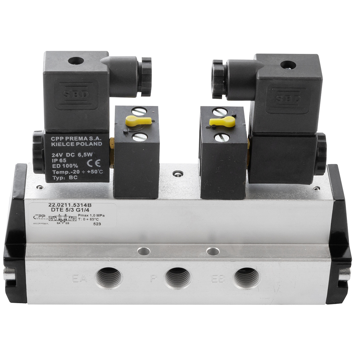 22.0211.5318J - Elektrozawór DTE 5/3 G1/8 CO centralnie otwarty cewki 230V AC 6,5VA (zasilany przewodowo)