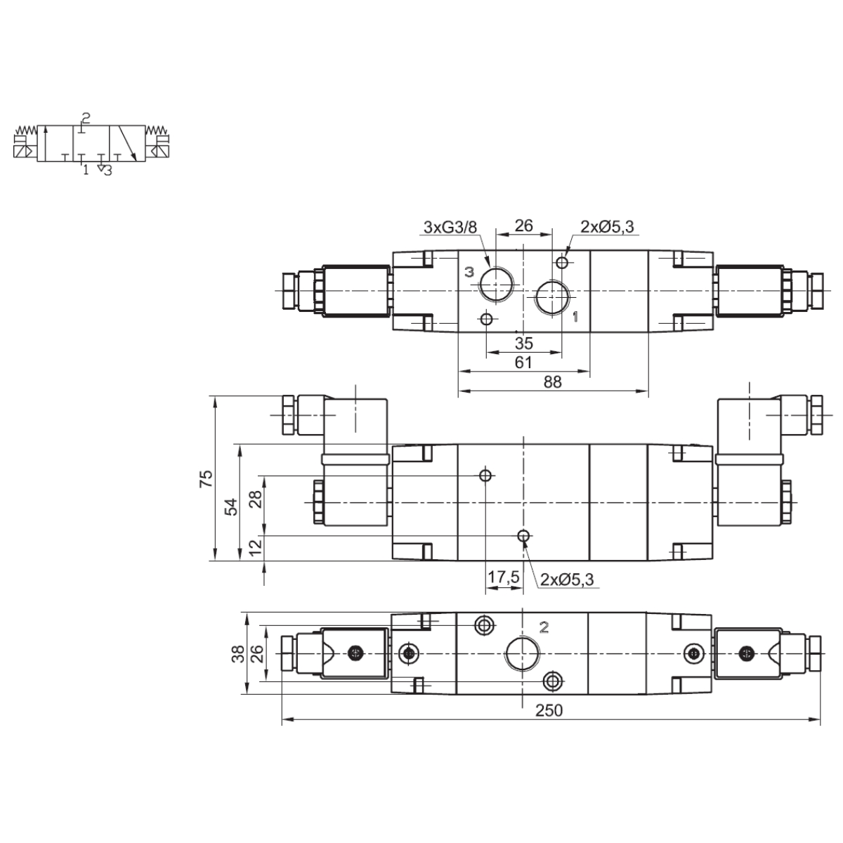 22.0809.3338J - Elektrozawór pneumatyczny ZE 3/3 G3/8 CC centralnie zamknięty cewki 230V AC 6,5VA