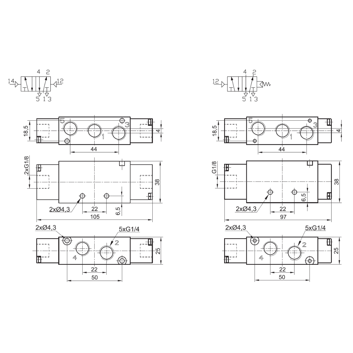 - Zawory 5/2 sterowane obustronnie pneumatycznie, bistabilne