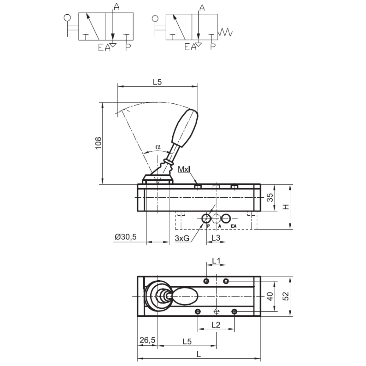 24.0108.3238 - Zawór rozdzielający ręczny DTM 3/2 G3/8 bistabilny z dźwignią (zasilany płytowo)