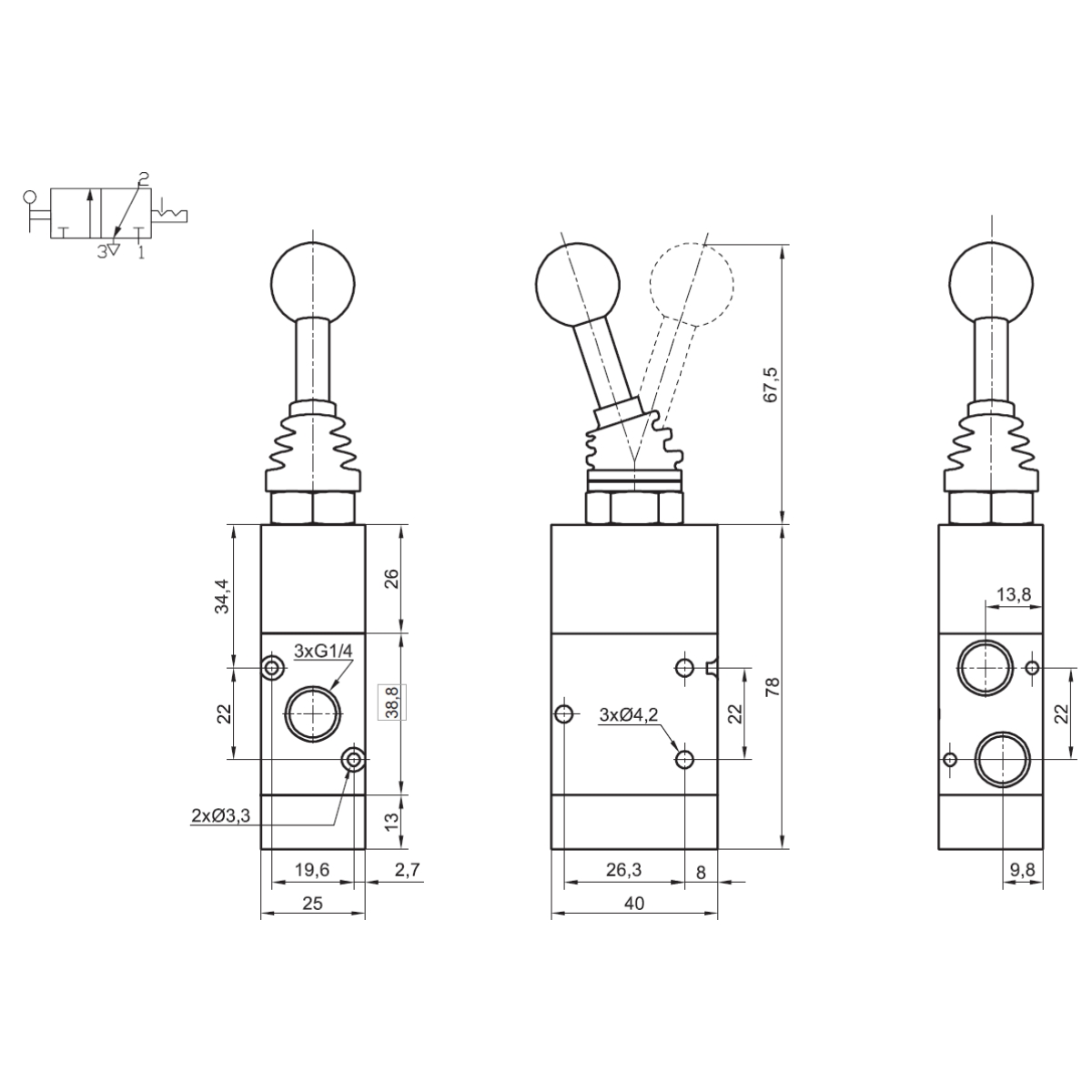 24.0510.3214 - Zawór z dźwignią TM 3/2 G1/4 NC normalnie zamknięty bistabilny bez sprężyn