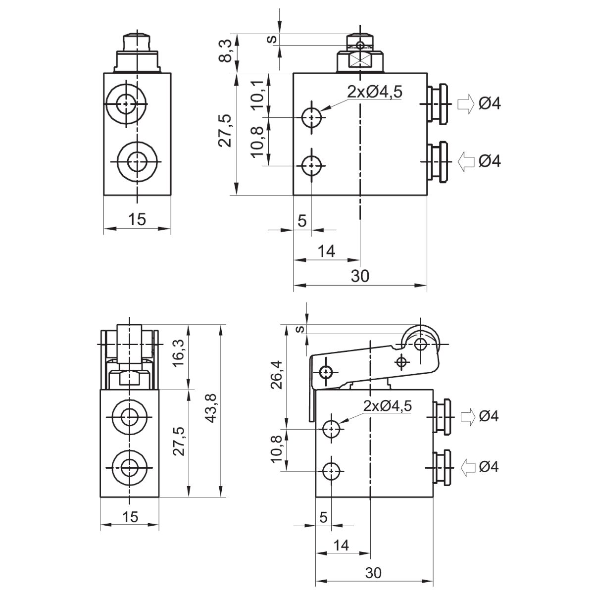 24.1601.204MAUL - Zawór mechaniczny 2/2 NC normalnie zamknięty, sterowany trzpieniem zasilanie boczne fi 4 mm