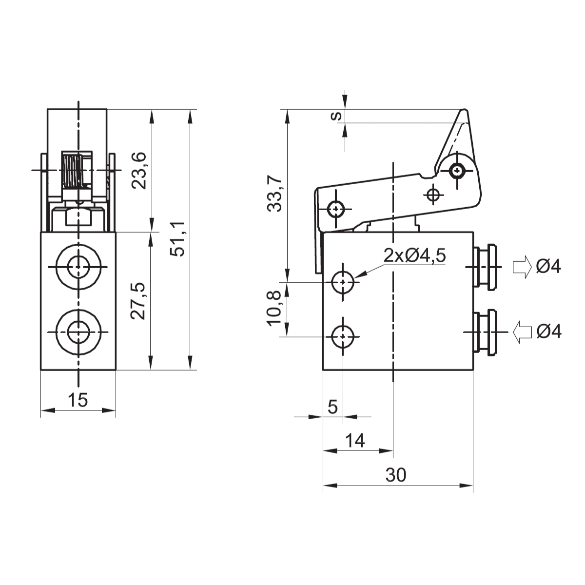 24.1603.304MRUL - Zawór mechaniczny 3/2 NC normalnie zamknięty, dźwignia z rolką zasilanie boczne fi 4 mm