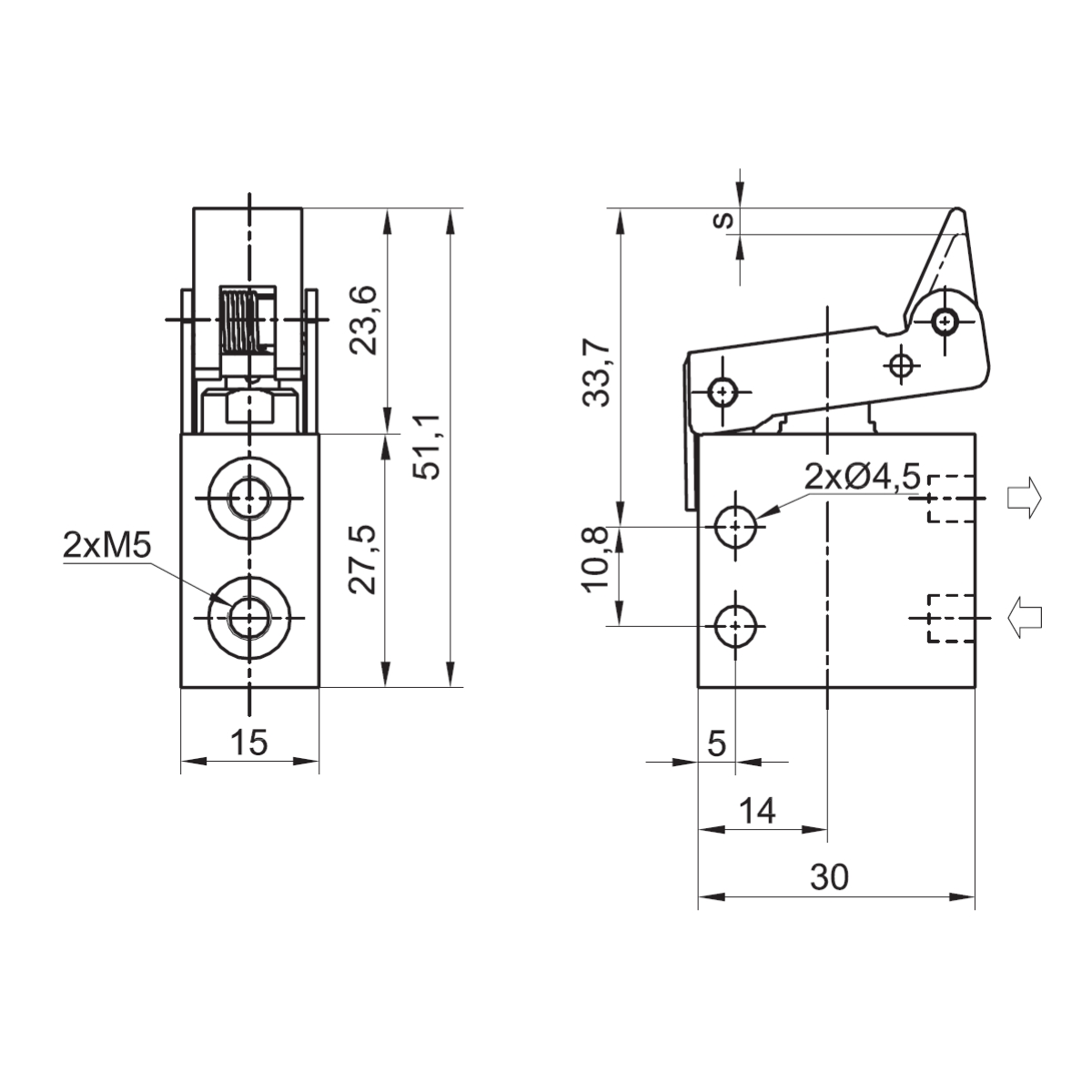 24.1605.305MSUL - Zawór mechaniczny 3/2 NC normalnie zamknięty, dźwignia jednokierunkowa zasilanie boczne M5