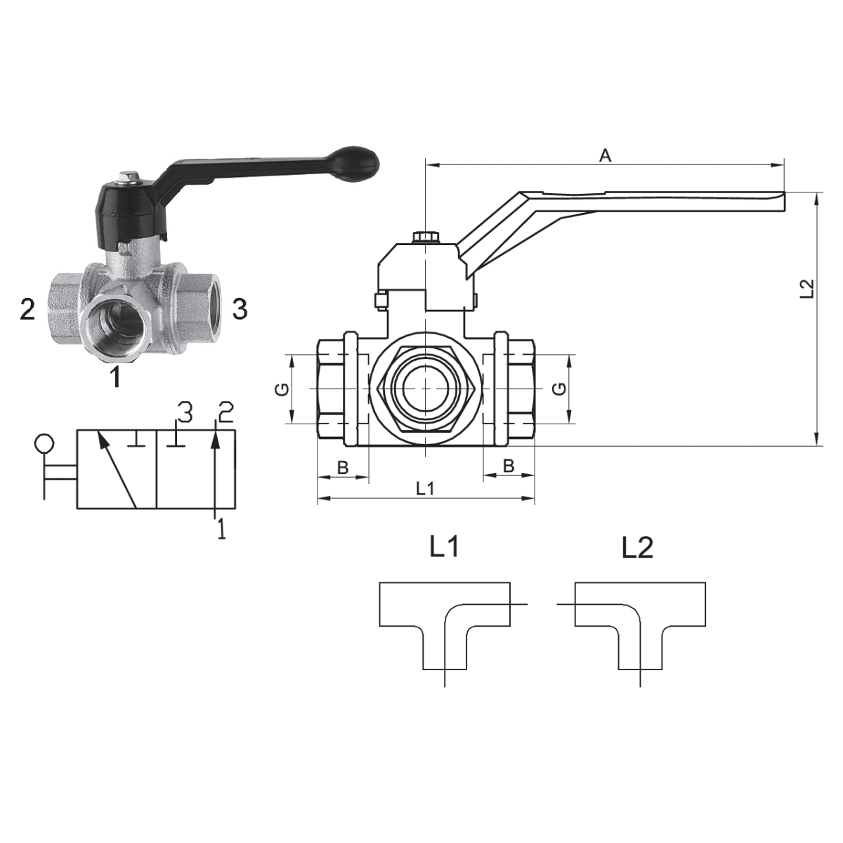 80.1081.A14 - Zawór kulowy trójdrożny typu L, R1/4 GW, 40 bar, mosiądz niklowany