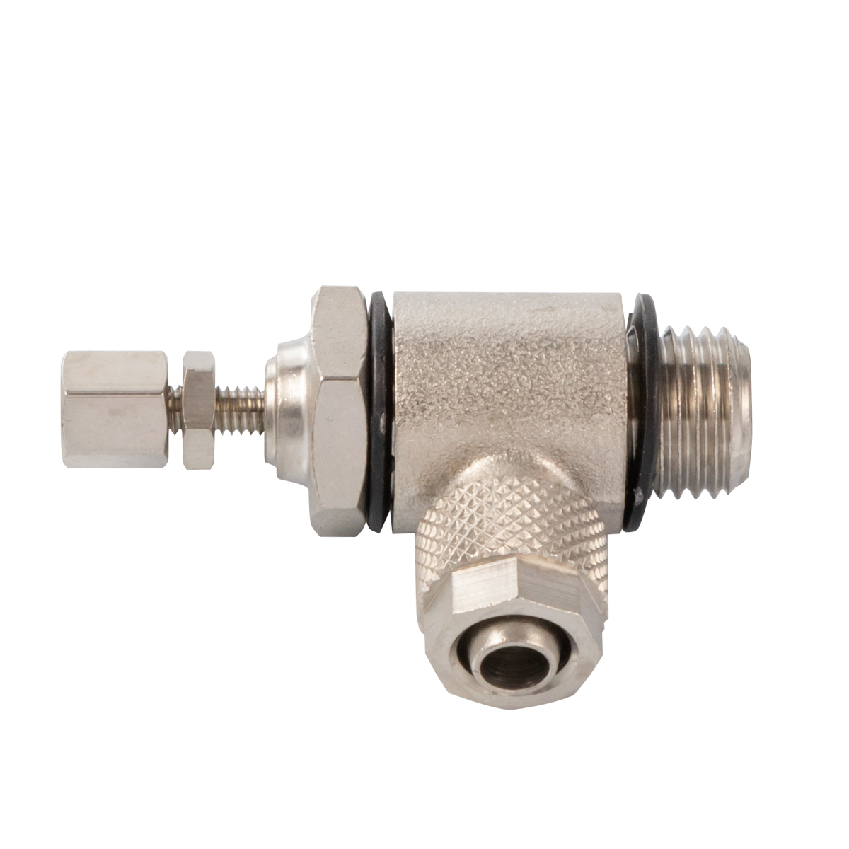 80.5082.18.0604 - Zawór dławiąco-zwrotny skręcany G1/8 na wąż fi 6x4 mm z regulacją pokrętłem, mosiądz niklowany