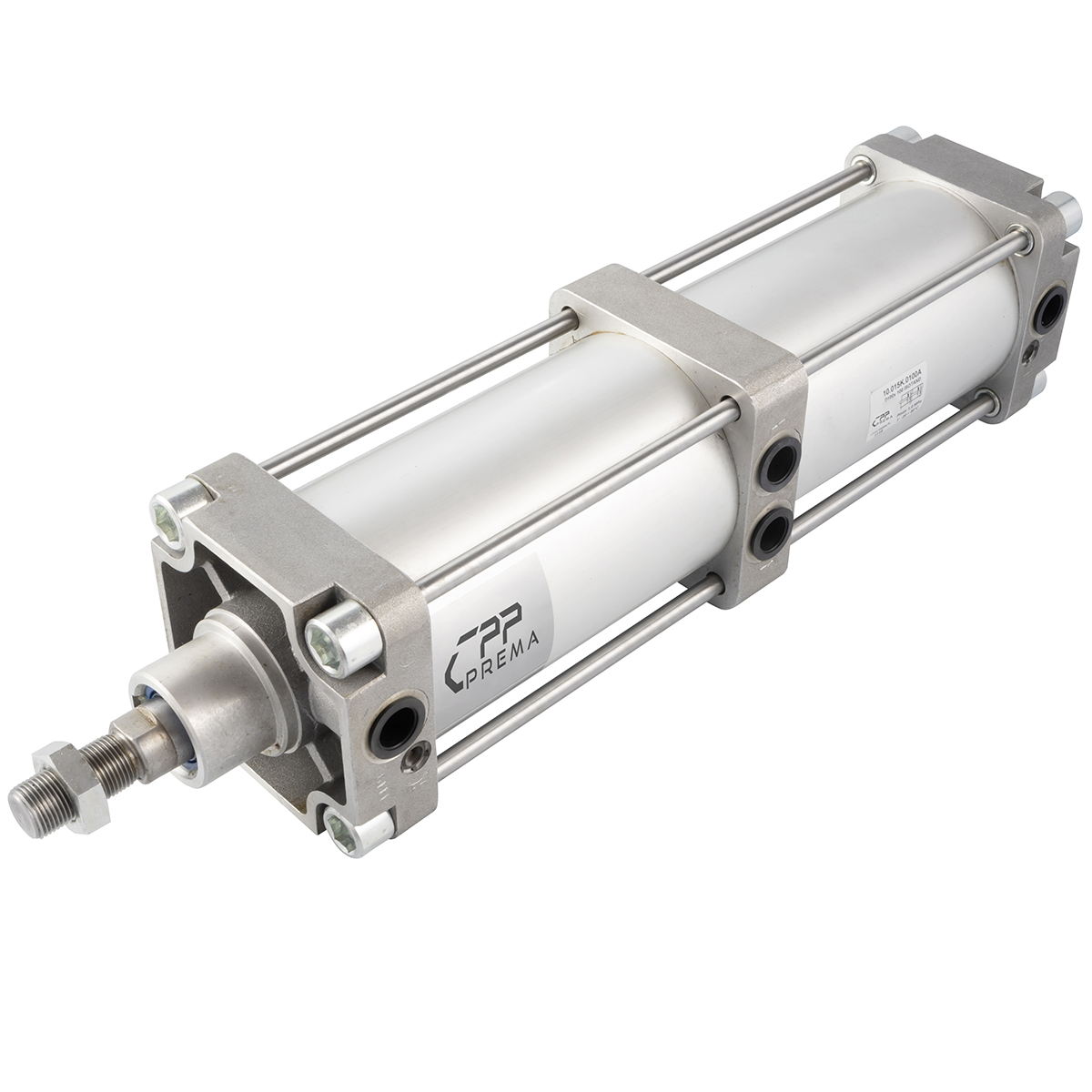 Konstrukcja tie-rod (szpilkowa) jest powszechna w siłownikach ISO, bo ułatwia demontaż i konserwację (wymianę uszczelek). Szpilki spinają pokrywy i tuleję, tworząc sztywny moduł. Przy siłownikach tandemowych, to rozwiązanie dalej się sprawdza: mamy dłuższe szpilki, a pomiędzy nimi sekcję pośrednią. Konserwacja wymaga tylko zdjęcia nakrętek i pokryw.