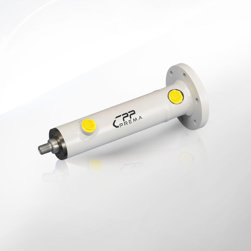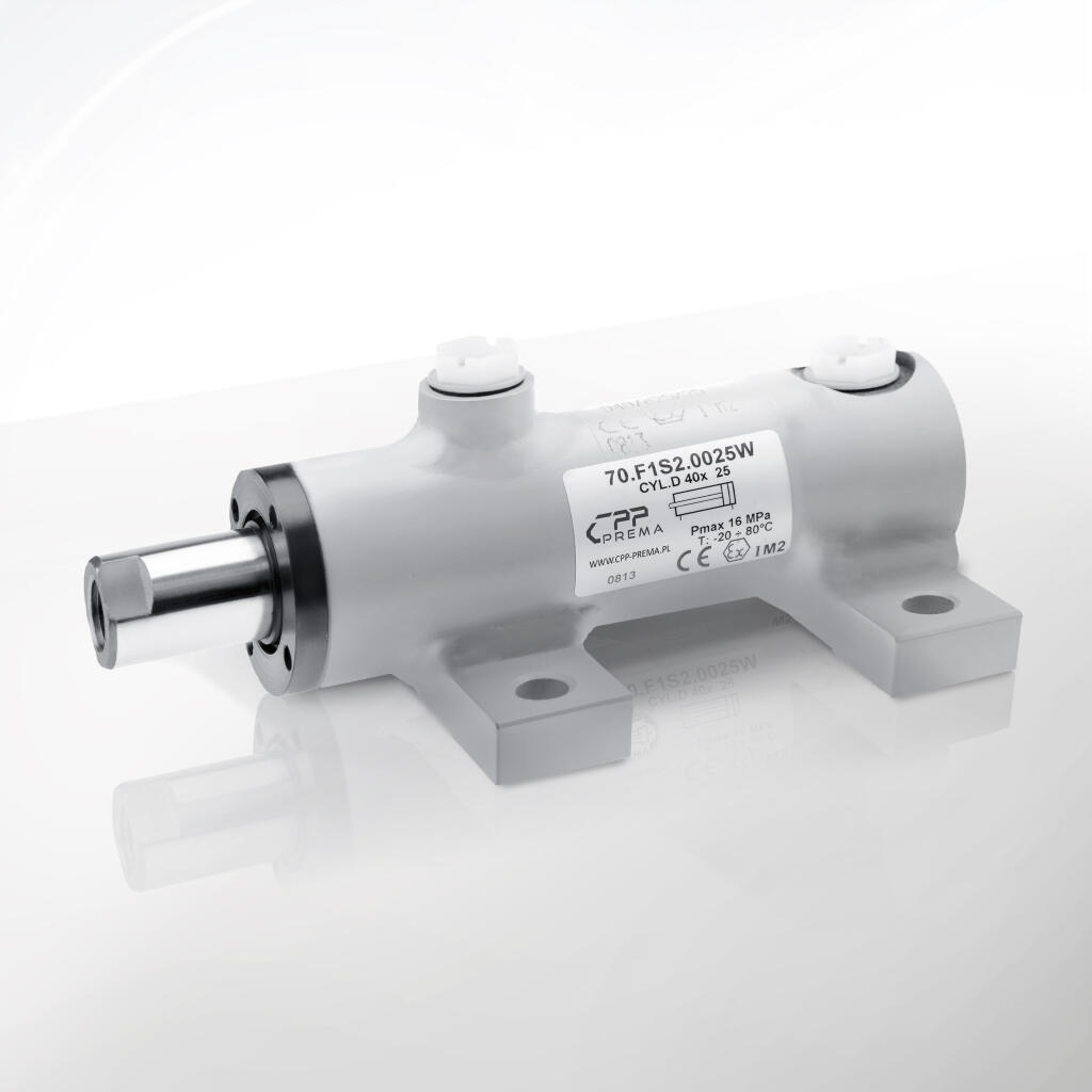 Siłowniki hydrauliczne dwustronnego działania CPP PREMA w rozmiarach D25-D160 tworzą jednolitą rodzinę napędów liniowych, które zamieniają energię ciśnienia cieczy roboczej na siłę mechaniczną w obu kierunkach ruchu tłoka. Linia obejmuje sześć wariantów mocowań: T4 UCJ5 (jarzmo na czopach), F4 UCJ4 (kołnierz okrągły dna), F3 UCJ3 (kołnierz okrągły głowicy), UCD6 2S2 (łapy poprzeczne + dwustronne tłoczysko), UCJ6 S2 (łapy poprzeczne, jednostronne tłoczysko) oraz UCJ2 P5 (ucho dna z łożyskiem przegubowym). Każdy siłownik posiada korpus ze stali E355, precyzyjnie honowany do chropowatości ≤ 0,3 µm. Tłoczysko wykonuje się ze stali C45 pokrytej chromem twardym o grubości 25 µm, co obniża współczynnik tarcia i chroni przed korozją. Standardowy układ uszczelnień zawiera pierścienie PU/NBR, pierścienie prowadzące z kompozytu PTFE-brąz oraz rezerwy smarne zapobiegające zatarciu przy wysokich prędkościach.
