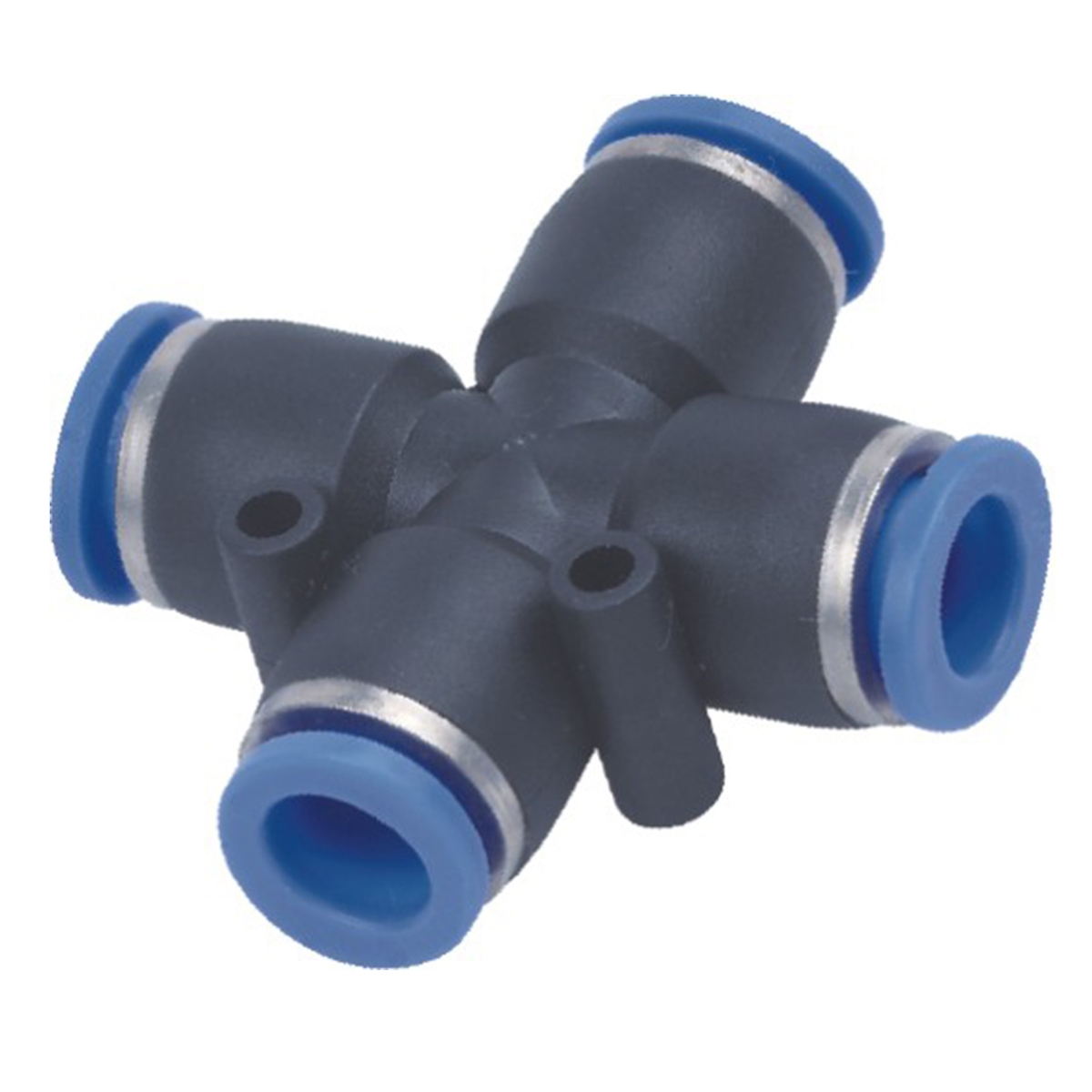 Czwórnik wtykowy do przewodu fi 6 mm: Bardzo popularny, umożliwia rozdział medium w typowych aplikacjach warsztatowych, w branży mechatronicznej oraz w niewielkich liniach produkcyjnych.