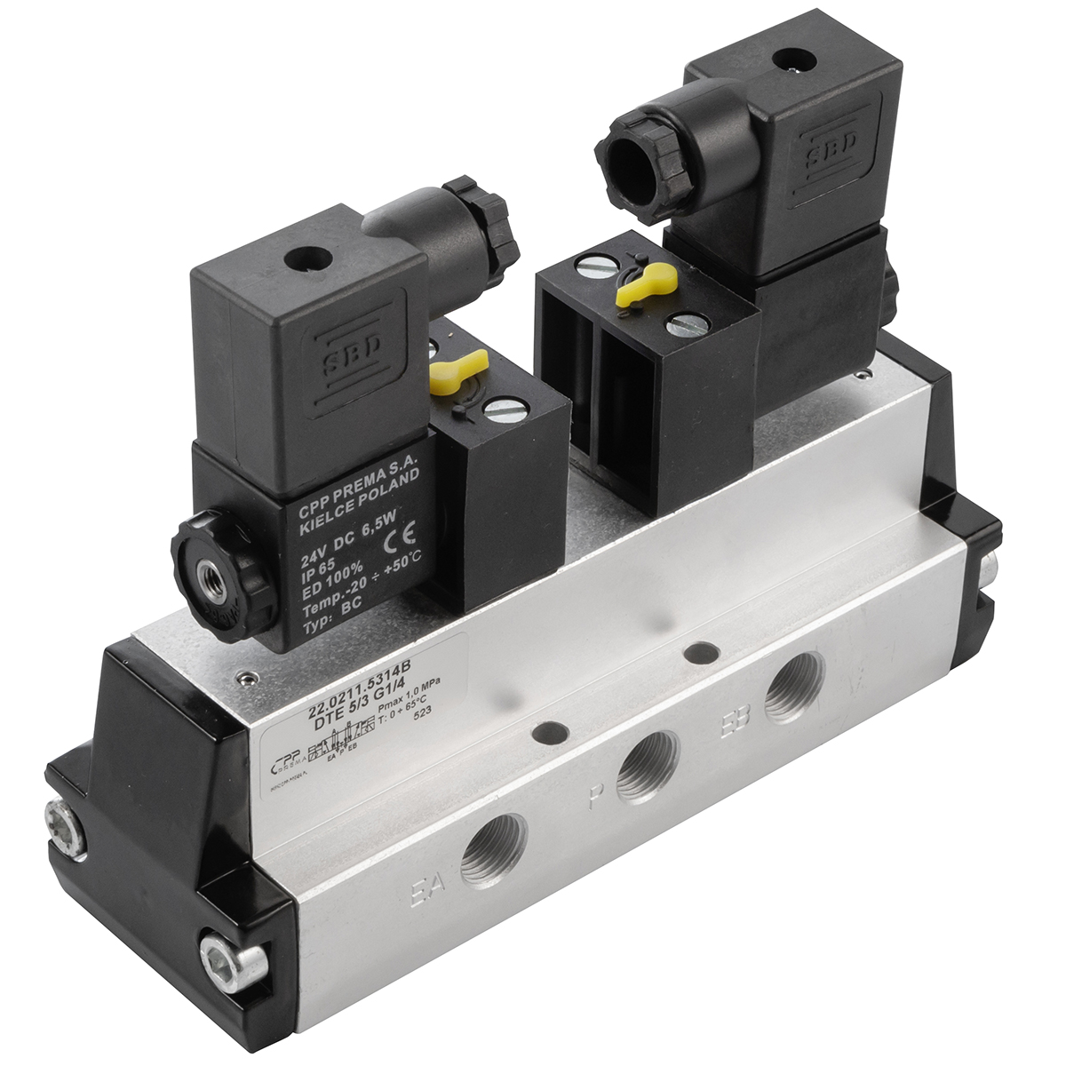 Elektrozawór DTE 5/3 G1/8-1/4 CO centralnie otwarty cewki 24V AC 6,5VA (zasilany płytowo)