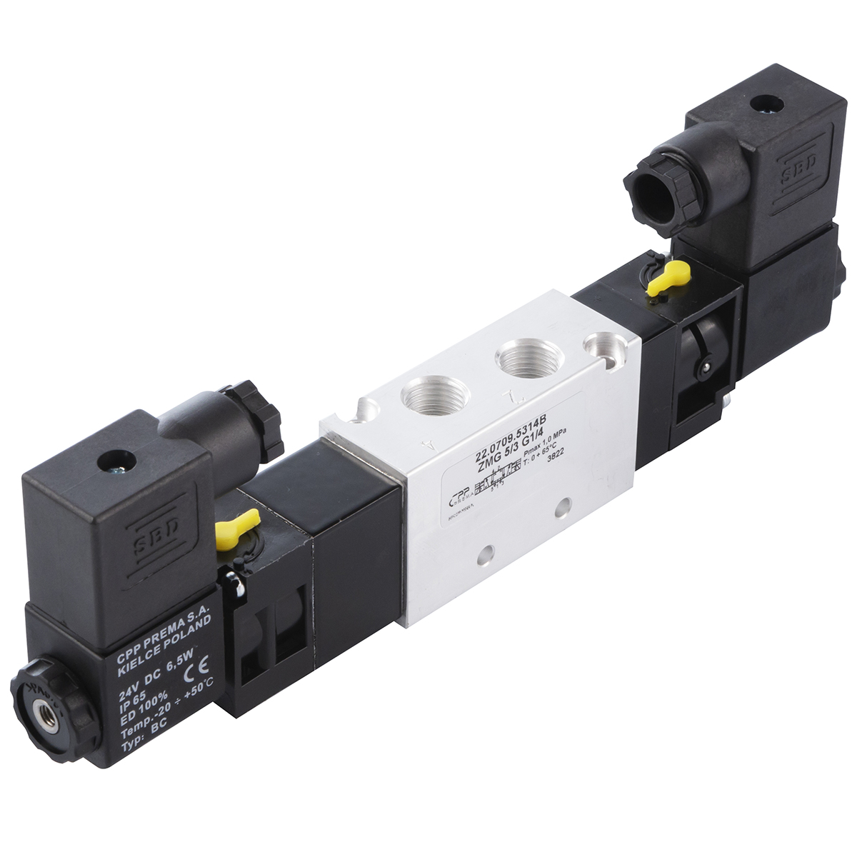 Elektrozawór pneumatyczny rozdzielający ZMG 5/3 G1/4 CO centralnie otwarty cewki 24V DC 6,5W