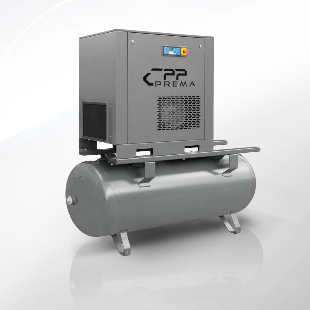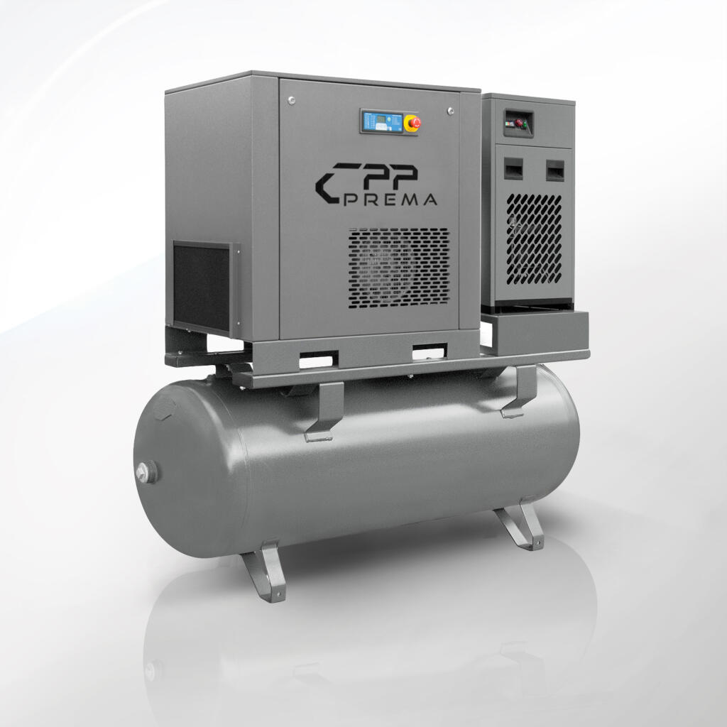Kompresory śrubowe z osuszaczem serii COMBO CPP PREMA stanowią zaawansowane technologicznie rozwiązania typu „all-in-one”. Urządzenie integruje stopień śrubowy z rotorem o profilu asymetrycznym, silnik elektryczny klasy IE3, zbiornik ciśnieniowy o pojemności 500 l oraz chłodniczy osuszacz powietrza z dwuetapową filtracją. Użytkownik otrzymuje kompaktowy system sprężania i uzdatniania powietrza, gotowy do natychmiastowego uruchomienia po podłączeniu do sieci zasilającej 400 V oraz instalacji pneumatycznej. Kompresory tej grupy oferują tryb „plug & play”, w którym konfiguracja ogranicza się do podstawowych ustawień sterownika mikroprocesorowego.
