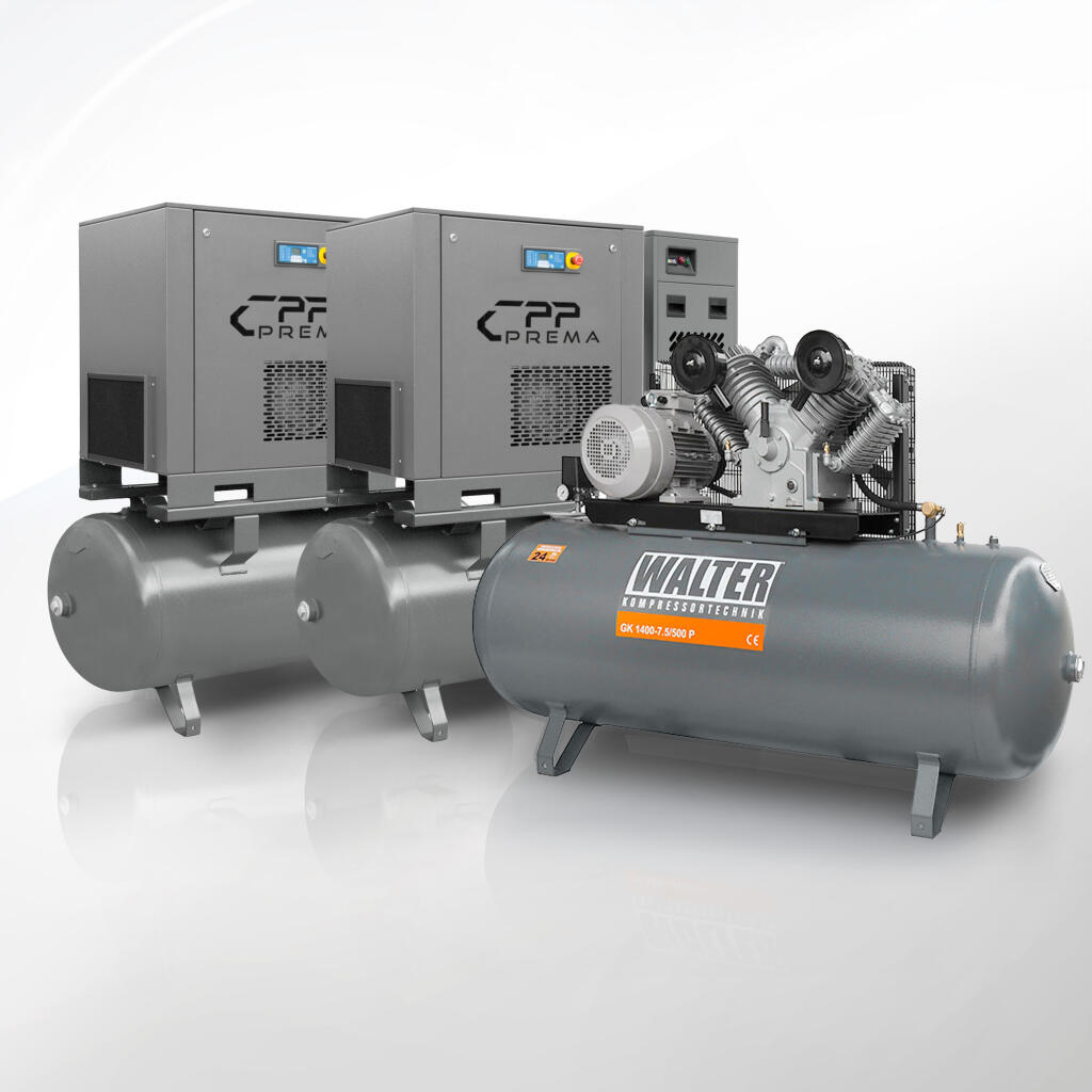 Kompresory tłokowe serii GK (np. GK420-2.2/100, GK1400-7.5/500) to konstrukcje dedykowane do warsztatów, mniejszych zakładów produkcyjnych oraz instalacji mobilnych. W tej grupie znalazły się modele z jedno- lub dwutłokowym blokiem sprężającym, żeliwnymi cylindrami oraz aluminiową głowicą chłodzącą. Kluczowe cechy to łatwość serwisowania, modułowa budowa, dostępność różnych pojemności zbiorników (50–500 l) oraz prosta obsługa dzięki zintegrowanym presostatom, reduktorom ciśnienia i automatycznym układom odprowadzania kondensatu. Tłokowe sprężarki powietrza CPP PREMA umożliwiają szybkie uruchomienie i natychmiastowe uzyskanie ciśnienia roboczego do 10 bar, a ich wytrzymałość potwierdzają testy długotrwałej pracy przy wysokich temperaturach i obciążeniu.
