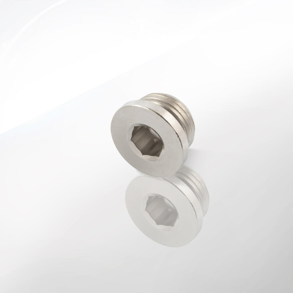 80.0132 – korki pod imbus z gwintem zewnętrznym i fabrycznie zamontowanym o-ringiem, mosiądz niklowany, do szybkiego uszczelniania stożkowego.