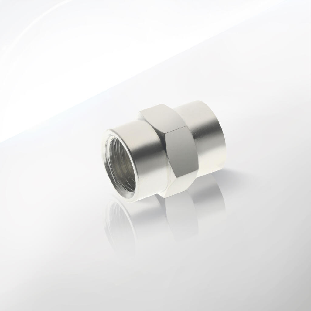 Podobnie jak seria redukcyjna, mufy 80.0124 wykonano z mosiądzu CW617N, niklowanego galwanicznie dla zwiększenia trwałości i odporności na korozję. Frezowanie gwintów CNC gwarantuje precyzję (tolerancja ±0,02 mm) i gładkość powierzchni (Ra ≤ 1,6 µm), co minimalizuje ryzyko uszkodzenia podczas montażu. Kompaktowe wymiary (długość 20–25 mm) umożliwiają instalację w ciasnych przestrzeniach.