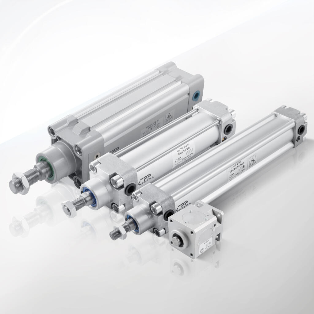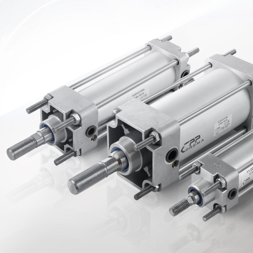 Siłowniki liniowe CPP PREMA występują zarówno w wersji dwustronnego działania (double-acting), gdzie tłok wykonuje ruch w obu kierunkach pod wpływem sprężonego powietrza, jak i jednostronnego działania (single-acting) – np. w siłownikach dociskowych z wbudowaną sprężyną, które wykonują pracę w jednym kierunku, a wracają do pozycji wyjściowej samoczynnie sprężyną. Standardem dla większości modeli są wbudowane magnesy w tłokach do współpracy z czujnikami położenia, a także amortyzacja pneumatyczna (regulowane tłumienie) na końcach skoku, pozwalająca płynnie wyhamować ruch tłoka. CPP PREMA jako producent z ponad czterdziestoletnim doświadczeniem kładzie nacisk na zgodność z normami wymiarowymi – siłowniki ISO 15552 (profilowe i z cięgnami/tie-rod) oferowane są w średnicach od D32 do D320 mm zgodnie z VDMA 24562, minisiłowniki ISO 6432 w średnicach D12–D25 mm, zaś siłowniki kompaktowe ISO 21287 w zakresach D16–D100 mm. Wersje CNOMO (seria SCN) obejmują typowe dla tej normy średnice od D32 do D200 mm, zapewniając ujednolicone wymiary montażowe preferowane m.in. w przemyśle motoryzacyjnym Francji i Włoch.