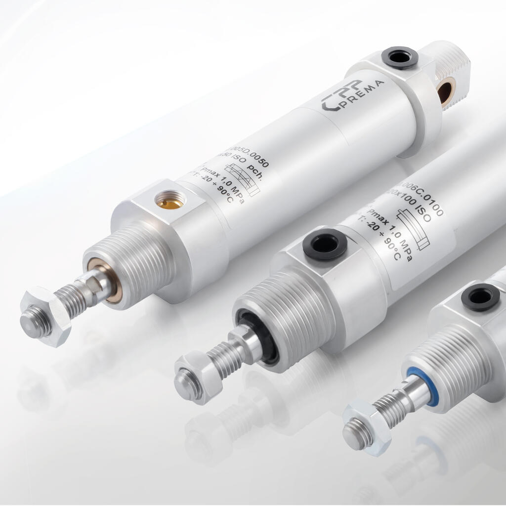 Korpus (tuleja cylindra): Większość siłowników wykonana jest z aluminiowych tulei o przekroju okrągłym lub profilem użebrowanym. Aluminium stosowane w cylindrach jest lekkie, a po poddaniu procesowi anodowania zyskuje twardą, gładką warstwę ochronną odporną na korozję i zużycie. W siłownikach typu ISO 15552 firma CPP PREMA wykorzystuje dwa typy konstrukcji: tuleje gładko-cylindryczne mocowane za pomocą cięgien (szpilek) ze stali oraz tuleje profilowe z rowkami montażowymi (np. seria FORTIS) – obie bazują na stopie aluminium łączącym niską masę z odpowiednią wytrzymałością na ciśnienie. W siłownikach kompaktowych korpus jest zazwyczaj jednolitą bryłą aluminiową (monoblok) z otworami i gwintami montażowymi zintegrowanymi w konstrukcji. Minisiłowniki ISO 6432 tradycyjnie posiadają tuleje ze stali nierdzewnej (cienkościenne rurki ze stali 304) lub z precyzyjnie szlifowanej stali węglowej chromowanej – co zapewnia idealnie gładką powierzchnię wewnętrzną przy bardzo małej średnicy. W przypadku serii SMI (D12–D25) stosuje się często mosiężne niklowane lub aluminiowe końcówki z tuleją ze stali nierdzewnej, co łączy wytrzymałość z odpornością na rdzę w małej skali. Siłowniki nierdzewne SPS posiadają tuleje i pokrywy wykonane w całości ze stali kwasoodpornej, co czyni je odpornymi na mycie chemiczne i korozję w środowiskach spożywczych.