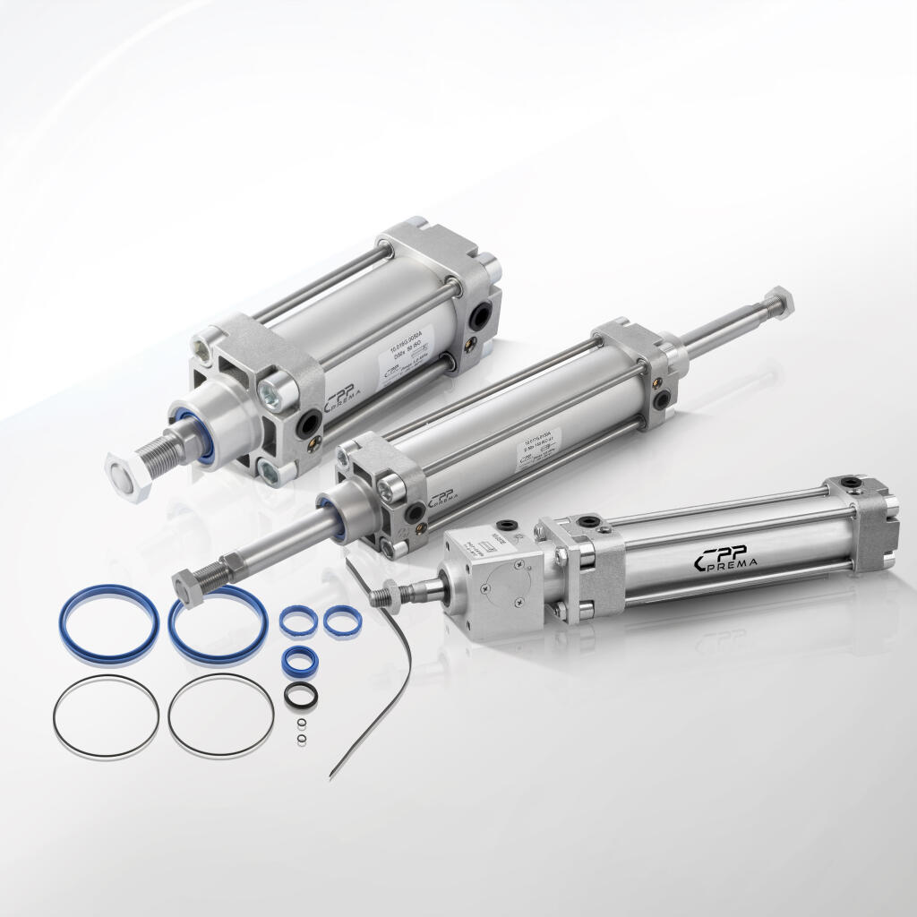 Opcje dodatkowe: CPP PREMA oferuje liczne opcje modyfikujące standardowy siłownik. Przykładowe oznaczenia obejmują: [AS] – tłoczysko wydłużone (dłuższe niż standardowo gwintowane zakończenie tłoczyska, np. dla montażu dodatkowych osłon mieszkowych lub nietypowego uchwytu), [AB] – przystosowanie do blokady tłoczyska (tłoczysko specjalnie obrobione pod mechanizm zaciskowy, który zatrzyma tłok przy zaniku ciśnienia), tłoczysko z gwintem wewnętrznym (otwór w końcu zamiast wystającego gwintu zewnętrznego), odmiany ATEX (do stref zagrożonych wybuchem), wersje z czujnikami położenia w zestawie, itp. Ponadto do wszystkich popularnych serii dostępne są zestawy naprawcze zawierające komplet uszczelnień i elementów zużywających się (oringi, uszczelki tłoka, zgarniacze, pierścienie prowadzące, zabezpieczenia) – co umożliwia samodzielną regenerację siłownika po dłuższym okresie eksploatacji.