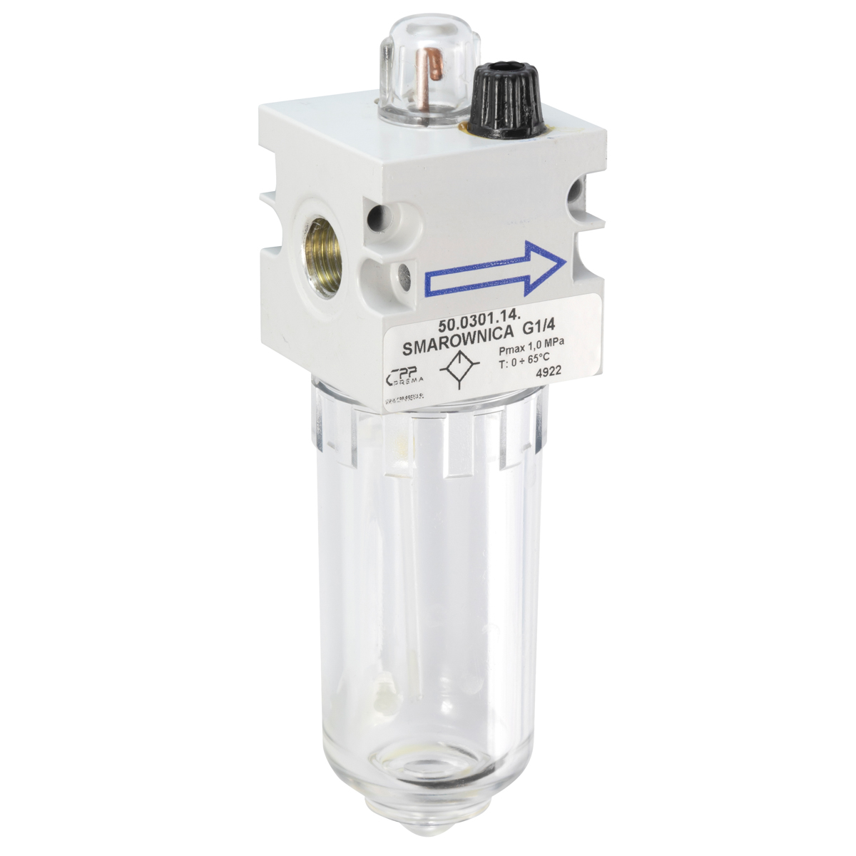 Smarownica sprężonego powietrza CPP PREMA z serii MINI G1/4" to urządzenie zaprojektowane do dokładnego dozowania oleju smarującego w kompaktowych układach pneumatycznych. Dzięki precyzyjnej konstrukcji oraz zastosowaniu wysokiej klasy materiałów, urządzenie spełnia wszystkie normy techniczne i przemysłowe. Poniżej przedstawiono szczegółowe dane techniczne, które definiują właściwości użytkowe i eksploatacyjne tego modelu.
