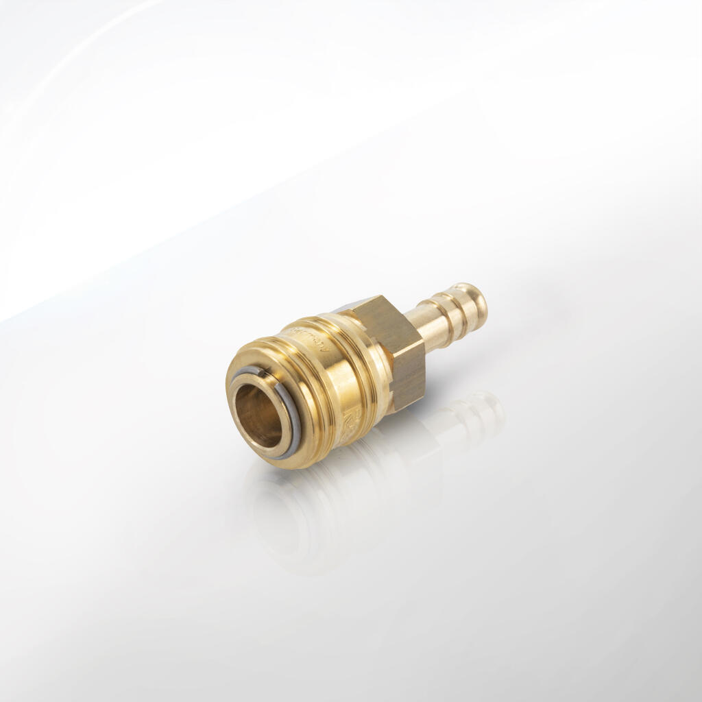 Szybkie i bezpieczne łączenie – wystarczy wsunąć króciec w gniazdo, by usłyszeć kliknięcie zatrzaśnięcia. Odłączając, odciągamy tuleję, a zawór w gnieździe automatycznie zamyka przepływ (pozwalając bezpiecznie uwolnić ciśnienie z węża).