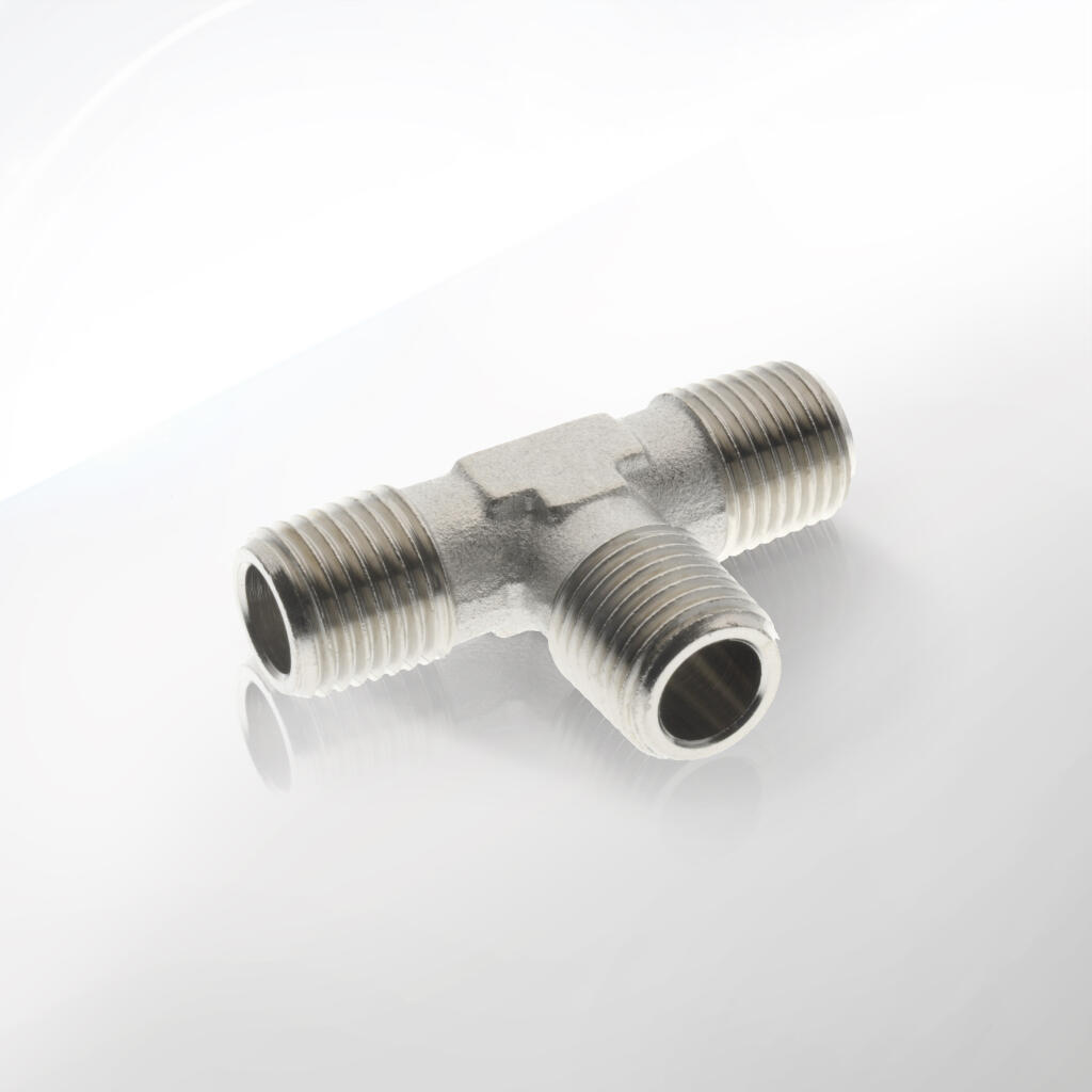 Trójniki typu T ZZW – mosiądz niklowany, seria 80.0202, z uszczelnieniem stożkowym.