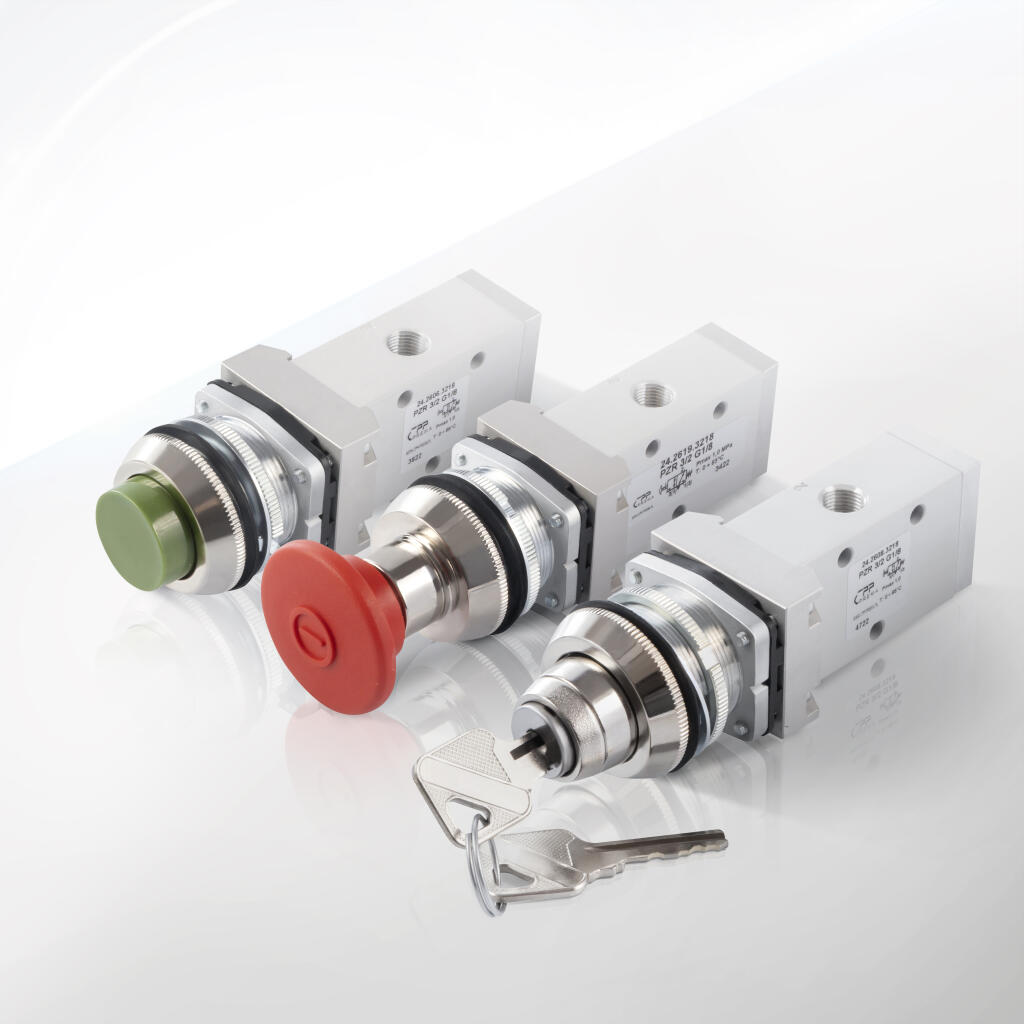 Zawory sterowane przyciskiem: Bardzo popularna forma w niewielkich instalacjach i stanowiskach, bo nacisk przycisku jest intuicyjny. Można spotkać odmiany z przyciskiem wystającym, z blokadą (zamkiem) czy przyciskiem ryglowanym. W stanie bistabilnym zwalniamy przycisk, a suwak nie wraca sam. Jeśli projektant pragnie, by stan został pewnie utrzymany, często wybiera wariant przycisku ryglowanego.